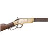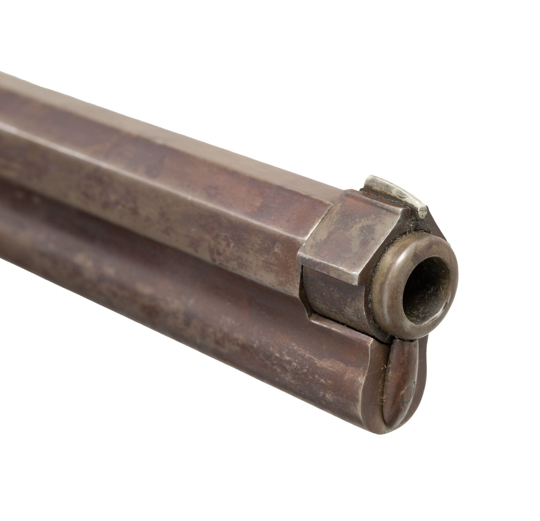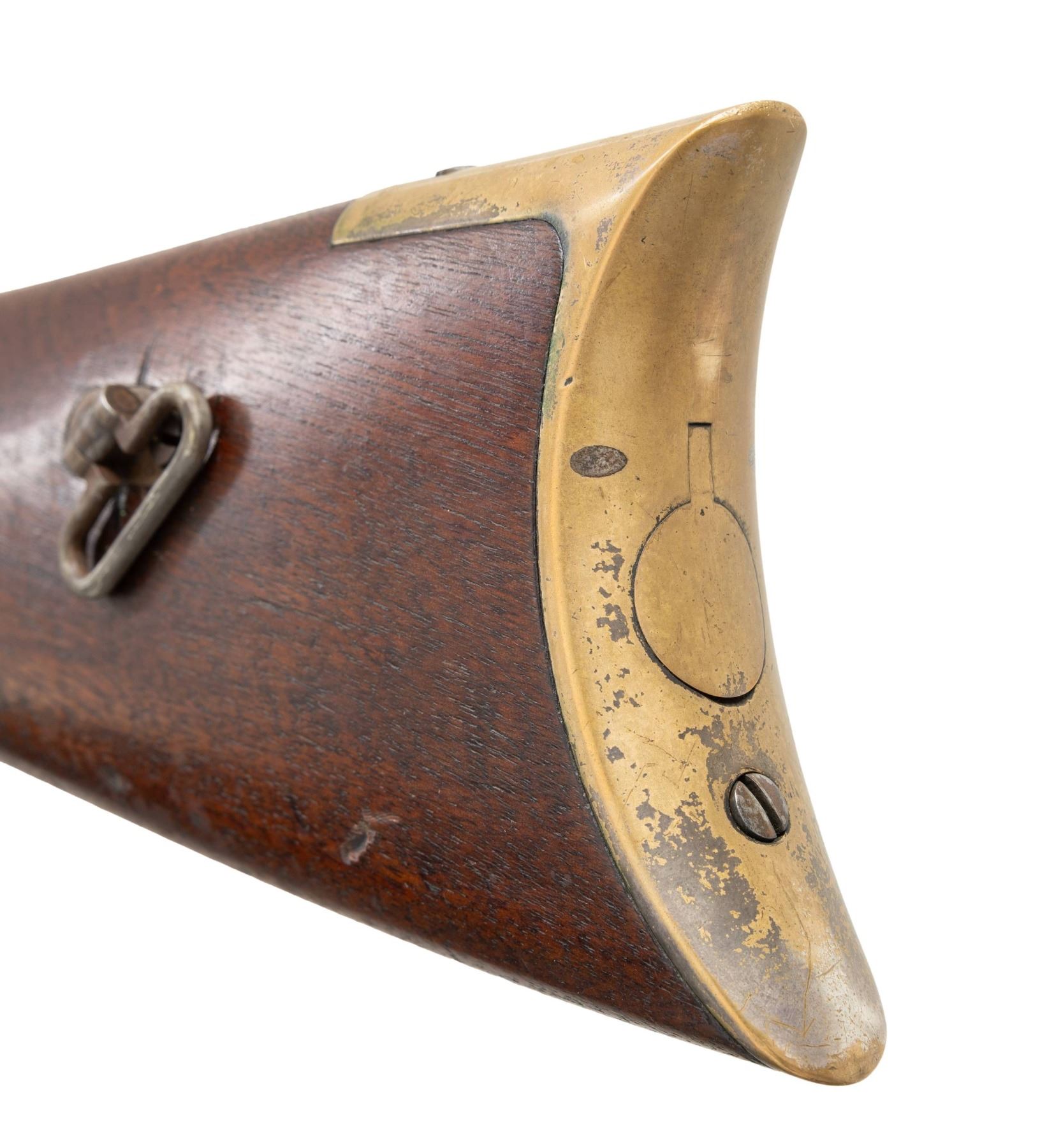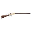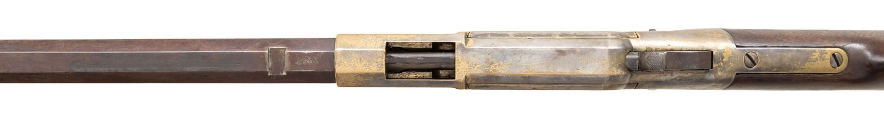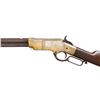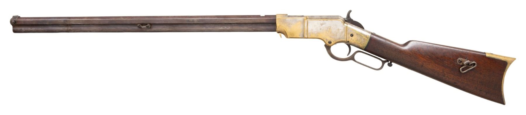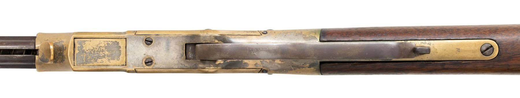 Cal. 44. S# 5509. This honest survivor was made in 1864 and has all the characteristics proper for this 5th variant. Matching serial numbers are found on 24" octagon barrel, stock, and 2nd type pointed buttplate. Frame & buttplate are silver plated which is rarely seen. Sling swivels are mounted on the left side of stock and barrel. More Henrys were made in 1864 than any other year, estimated production at about 4000 with many if not most being sold privately for use in the Civil War.CONDITION: good to very good overall, complete and matching, missing rear sight. Brass retains about half its silver plate, less on buttplate. Barrel is mottled dark gray/plum. The proper 2-line all serif barrel address is very good, as are all serial number stamps. Stock is sound with normal handling marks. Mechanically fine with crisp rifled bore. (01-26797/JS). ANTIQUE. $9,000-14,000.