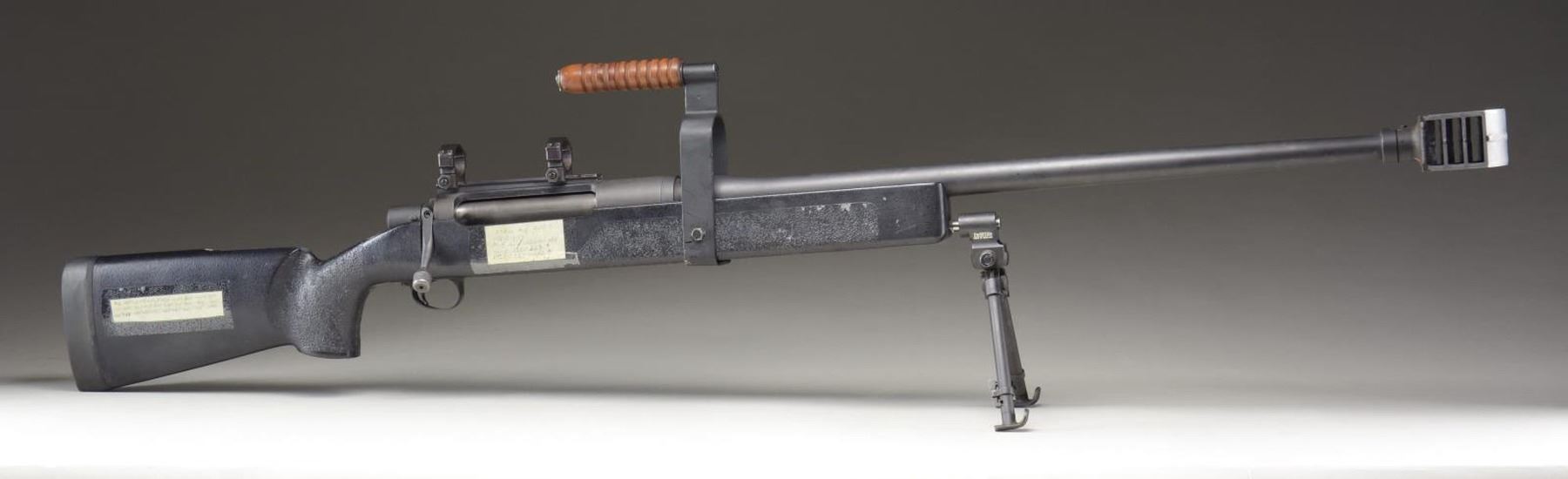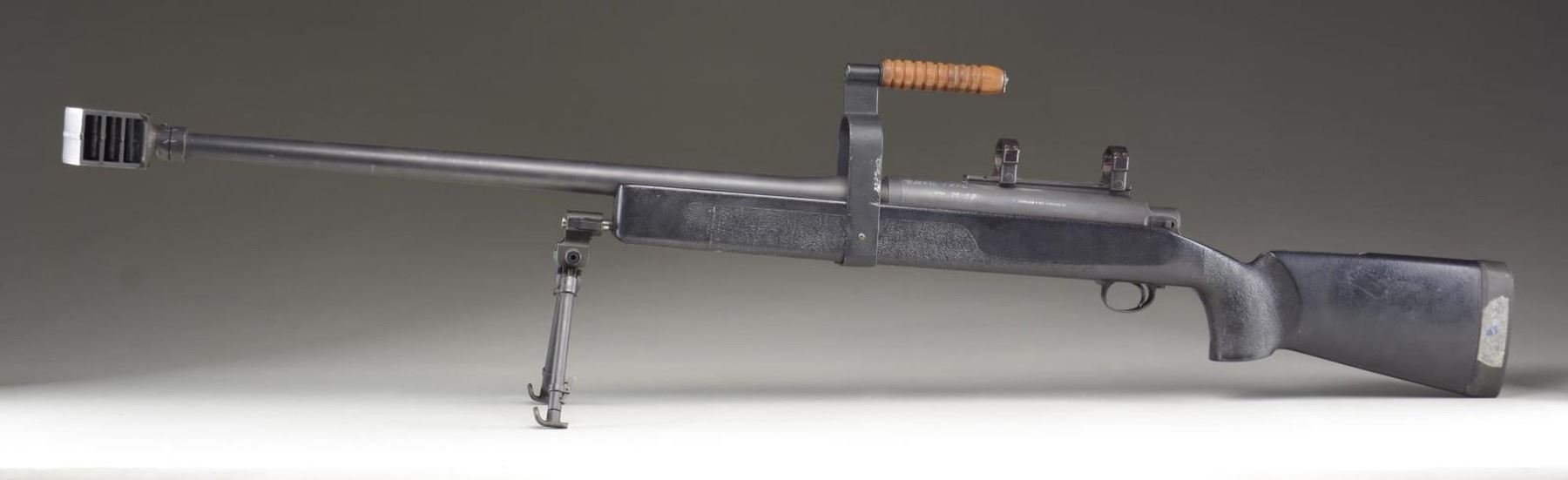 Cal. 50 BMG. S# 50423. Bbl. 28". Single shot, bolt action rifle. Parkerized finish. Composite stock w/ thick rubber recoil pad. Parker Hale folding, extending QD bipod mounted on stud below barrel. Large, 3 chamber muzzle brake. Stirrup style carry handle mounted over chamber section. 6.5" Weaver base & rings. Receiver marked; "Barrel 1x12 / M-87" by prior owner on left side. Right side of stock has a few dope cards taped on cheek piece & below chamber. CONDITION: Finish varies from heavy to thin, representing prior use on all metal surfaces as well as stock. Action is smooth. Bipod functions as intended. Bright bore w/ strong rifling. (24-2007/JZ). MODERN. $2,500-3,500.