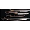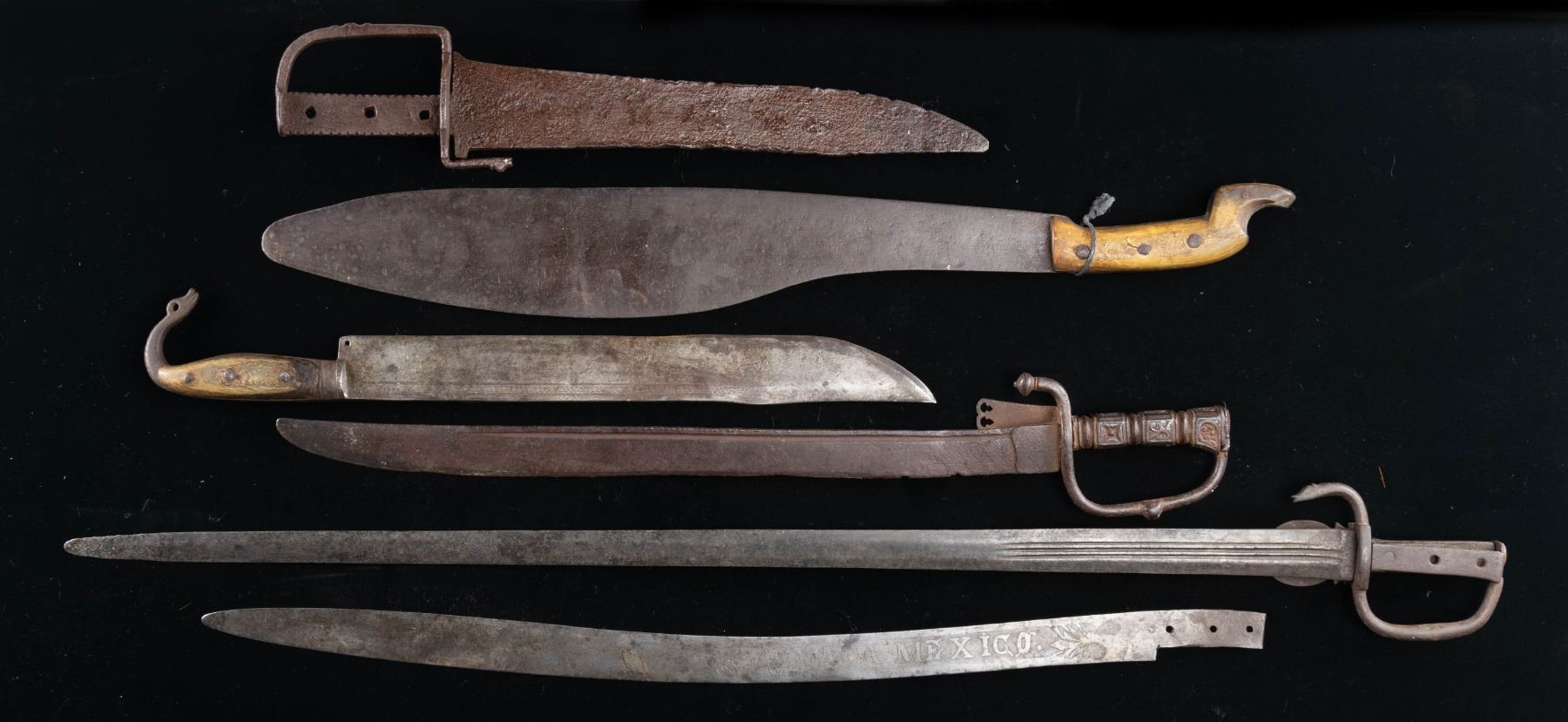 WEAPONS. Well patinaed group of Mexican edged weapons, espada anchas have been made same way for 200 years, the 3 in this group are each unique in design. There is presentation sword blade by premier Mexican cutler "Aragon" to "Coronel Prisciliano M. Benites". There are also 2 horn gripped bolo/machetes, the larger is maker marked. CONDITION: good to very good overall, iron patina, one espada ancha has no grip. PROVENANCE: Estate Collection of Compton LaBauve Jr. (02-26467-1/JS). NON-GUN. $800-1,200.