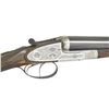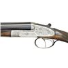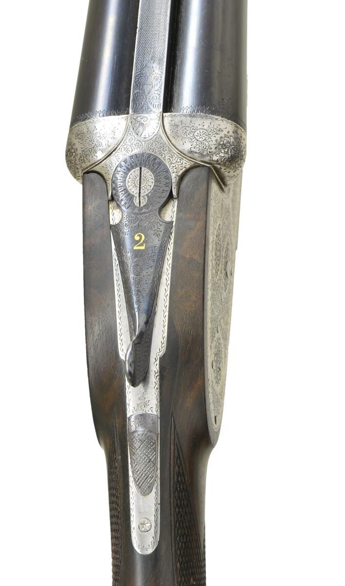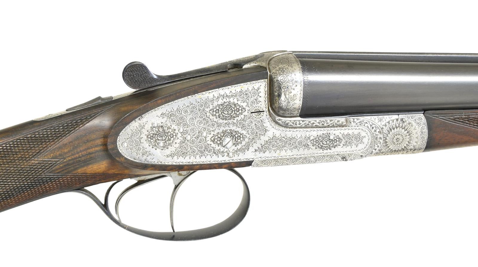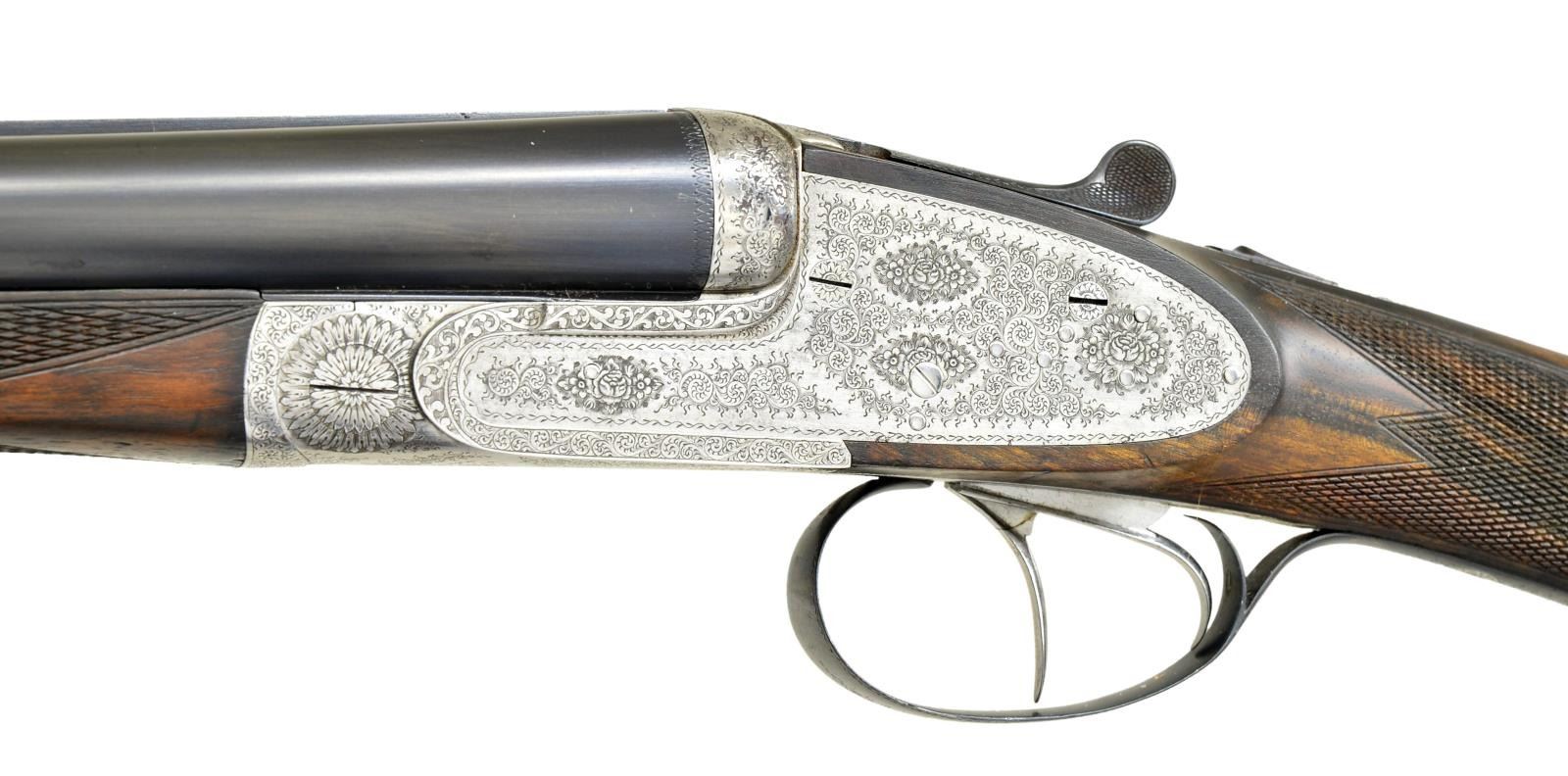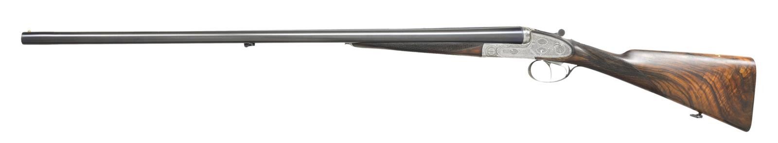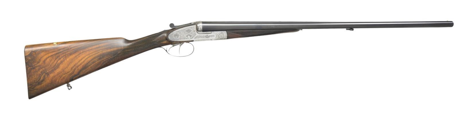 GAMEGUN. Cal. 16 Ga. 2 1/2". S# 2309. The firm of Gastine Renette of Paris has always been known for its fine quality guns. This sm. bore example has 28 3/8" dovetailed bbls. engraved "Gastinne-Renette Paris" on concave matted game rib. Bbl. flats are stamped w/ French nitro proofs. Bottoms of bbls. are stamped w/ "Toledo Steel" information. A sling loop is screwed to bottom rib. Coin finished sidelock action is stocked to the fences & features nonautomatic safety ("SAFE" inlaid in gold), Purdey type hidden 3rd fastener, bushed strikers, engraved line tumbler end cocking indicators, sm. reinforce to frame & dbl. triggers (front articulated). Action is engraved w/ near full coverage British style rose & scroll. The scroll is not shaded, in continental style, but the rose bouquets are very nicely detailed. The action reinforce is engraved w/ semi relief scroll. Bottom of action is engraved w/ maker's name & address. Trigger guard is blued & engraved to match. Gun is No. 2 of a pair with "2" gold inlaid on top lever. Straight grip buttstock, of very attractive nicely marbled & well figured European walnut, measures 14 1/4" over checkered wood butt. Point pattern checkering is at grip & the individual initials "J.D.W" are inlet on rear of comb. A sling loop matching that on bbls. is on toeline. Matching splinter ejector forend has Anson release. MEASUREMENTS: BBLS: Bore Diameter: R .667", L .667". Restriction: R .008" (IC), L .025" (FULL). Min. Wall Thickness: R .032", L .030". STOCK: DAH: 2 1/4". DAC: 1 1/2"+. LOP: 14 1/4". CAST: approx. 5/8" off. WEIGHT: 6 lb. 5 oz. CONDITION: very good as refinished, bbls. retaining nearly all of a best reblack. Engraving & matting still good. Action is repolished to coin finish w/ a few scattered sm. pits, mostly on left fence. Stocks are nicely refinished in oil w/ a few scattered marks, checkering is recut. Bores are shiny w/ some scattered frosting, bordering on light pitting, mostly in right bbl. Action is tight. Bbls. are on face. Ejectors are strong & in time. (22-1154/MGM). CURIO. $4,000-8,000.