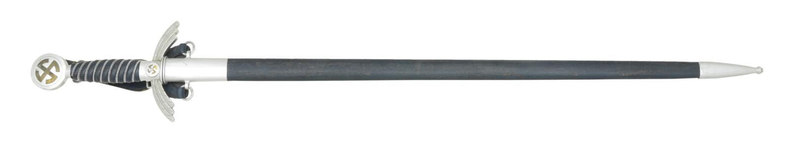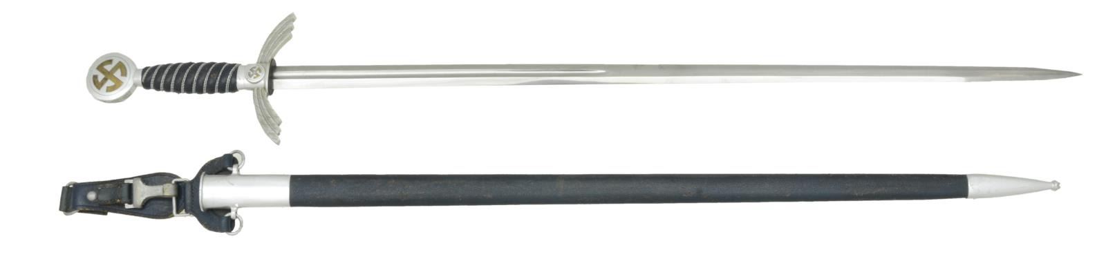 BAG. Overall length 38 3/8". Blade length 30". Blade has a central fuller that is marked near the hilt “(king) SMF SOLINGEN”. There is a small waffenamt above the mark that appears to be an eagle but the number is illegible. Aluminum guard emulating feathers with a mobile central party symbol. Pommel has a similar mobile party symbol with oak leaves at the edge. Wire wrapped blue leather grip. Blue leather wrapped scabbard with aluminum throat & tip. Original blue leather hanger attached. Sword is complete with appears to be original dark blue felt sword bag. CONDITION: blade has substantial original factory polish. Hilt shows light overall wear. Grip shows a few a few scuffs & scrapes with minor losses on one edge. Wire is complete. Scabbard shows very light overall wear. Sword bag shows scattered moth damage overall. PROVENANCE: From the Lifelong Collection of Glen E. Mattox. (02-18219/BF). $1,000-1,400.
