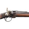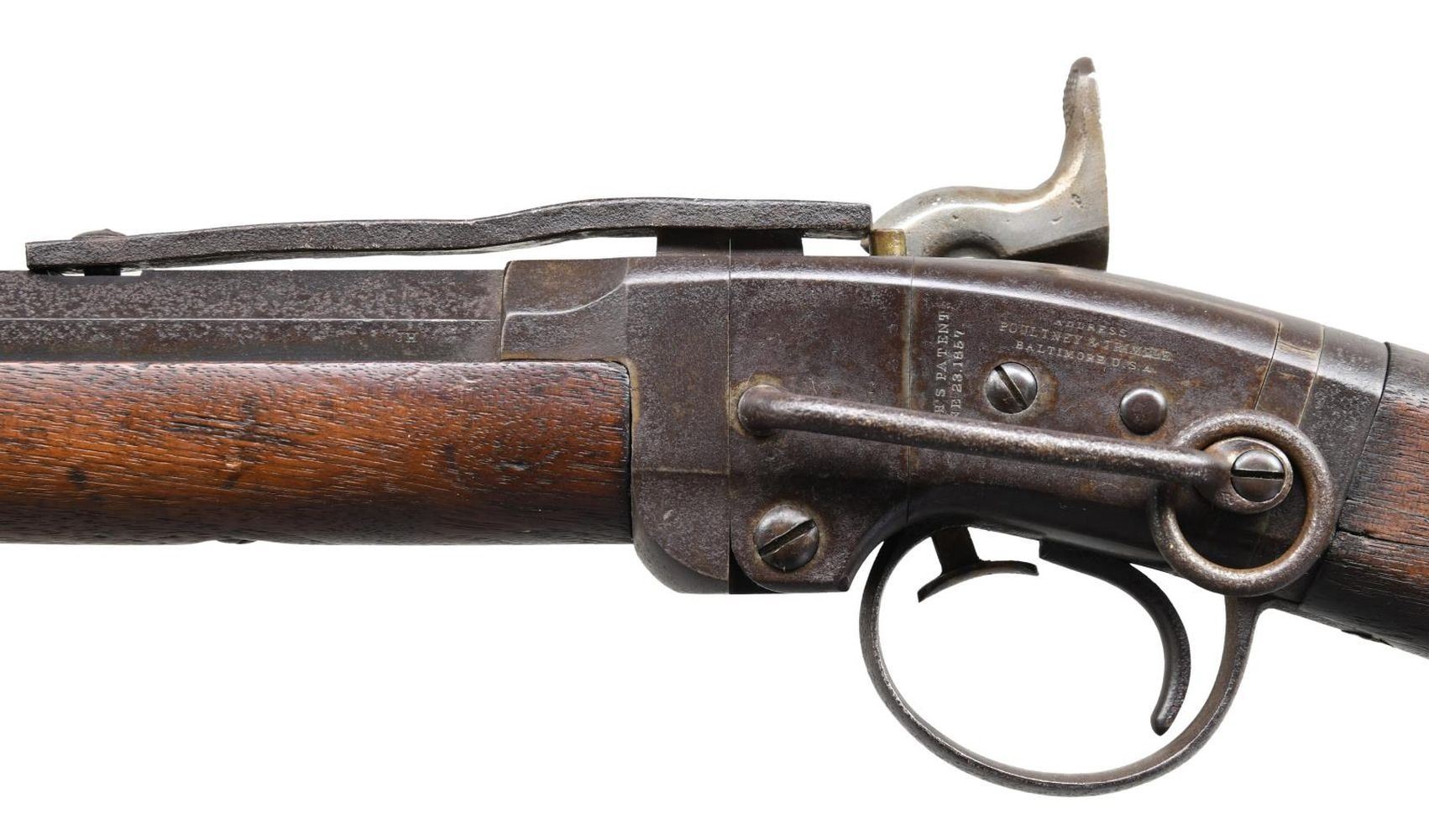 Cal. 50. S# 6643. Bbl. 21 1/2" w/ rnd. octagon shank. Blade front sight w/ carbine leaf rear sight. Bbl. is released by pushing upward on the latch forward of the trigger & rotates downward for loading. Band fastened walnut forearm & straight grip stock w/ steel carbine buttplate. Estimated quantity of 30,000 mfg. 1861-65. CONDITION: lightly pitted metal has brown appearance. Wood shows heavy wear & handling marks w/ cracks through wrist area. Replacement hammer. 1 Lower tang screw is a replacement. Breech fastening strap on top of bbl. is a blacksmith replacement, too short to operate properly w/ the lever & not allowing the gun to open properly. Bore retains intact rifling showing spots of light pitting. (01-24471/DS). ANTIQUE. $500-800.
