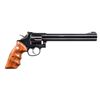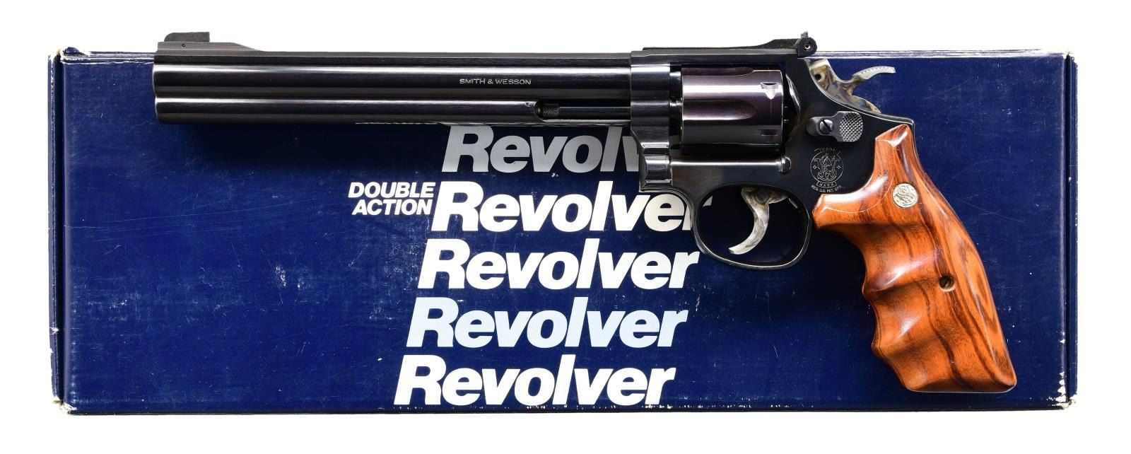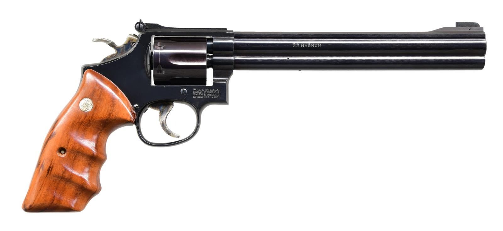 Cal. 32 H&R Mag. S# BFM3524. Bbl. 8 3/8" w/ full underlug. Patridge front sight. Adjustable square notch rear sight. Blued finish w/ case colored target hammer & trigger. Goncalo Alves wood combat grips w/ silver S&W medallions UNATTACHED ACCESSORIES: matching numbered factory box w/ manual, cleaning kit & paperwork. CONDITION: grips show a couple light handling marks. Hammer & trigger show light operational wear. Metal retains 98% original blue w/ a light turn line on cyl. & some light muzzle wear. Bright near excellent bore. (24-1722/MJC). MODERN. $1200-1800.