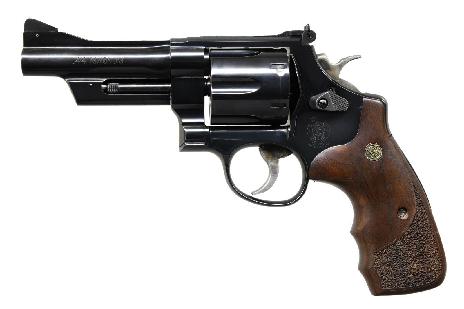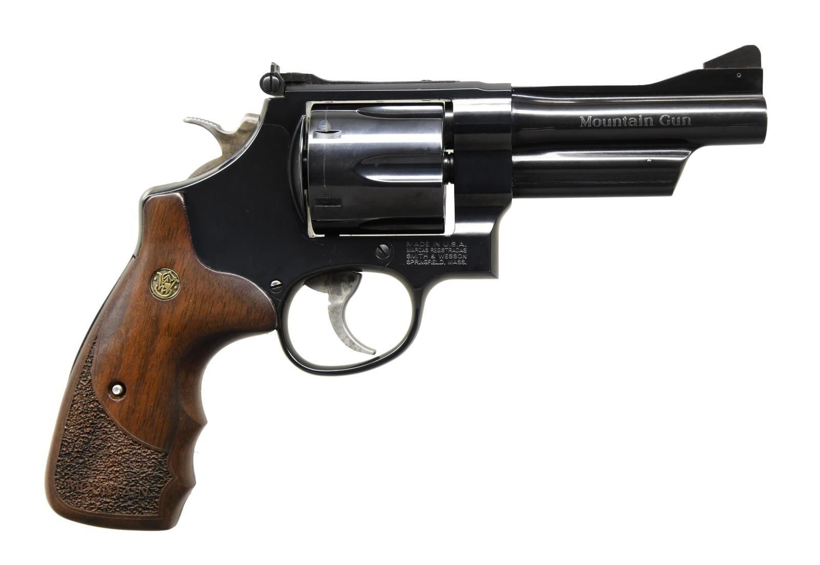 Cal. 44 Mag. S# DAK4354. Bbl. 4". Ramped serrated blade front sight. Adjustable rear sight. Blued finish w/ case colored hammer & trigger. Right side of bbl. marked "MOUNTAIN GUN". Mountain marked finger groove grips w/ gold S&W medallions. UNATTACHED ACCESSORIES: w/box. CONDITION: all aspects rate very good plus or better w/ a drag line on cyl., some operational wear & scratches on trigger & hammer. PROVENANCE: The Collection of Gun Sport Ltd owned by Jon R. Thomas. (23-3865/MJC). MODERN. $800-1200.