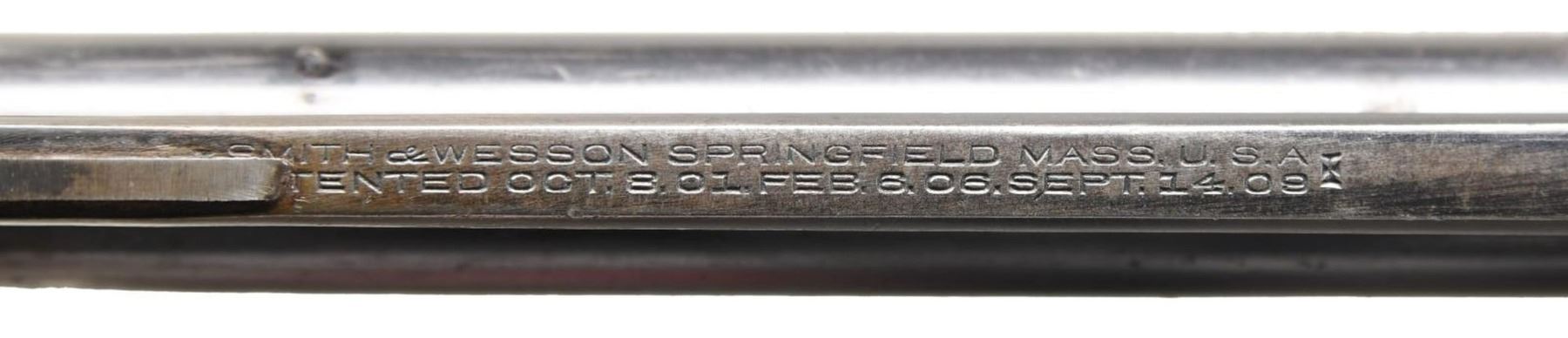 Cal. 22 LR. S# 615. Bbl. 7 1/4" shortened. Ramped blade front sight. Square notch rear sight. 2nd Model w/o recoil shield. Mfg. 1905-09. Blue finish. Case colored trigger, hammer & trigger guard. Front grip strap has factory star rework marking. Checkered brown rubber grips w/ factory logo. CONDITION: grips have a large 2" chunk missing at rear. Grips otherwise show scattered handling wear, scratches & dings. Trigger, hammer & trigger guard retain much of their case colors w/ some operational wear & scattered oxidation. Balance of metal retains 50% blue w/ a few patches of pitting, scattered oxidation, scratches & fading to brown. Good bright bore w/ some frosting near muzzle. (23-4691/MJC). CURIO. $1000-1500.