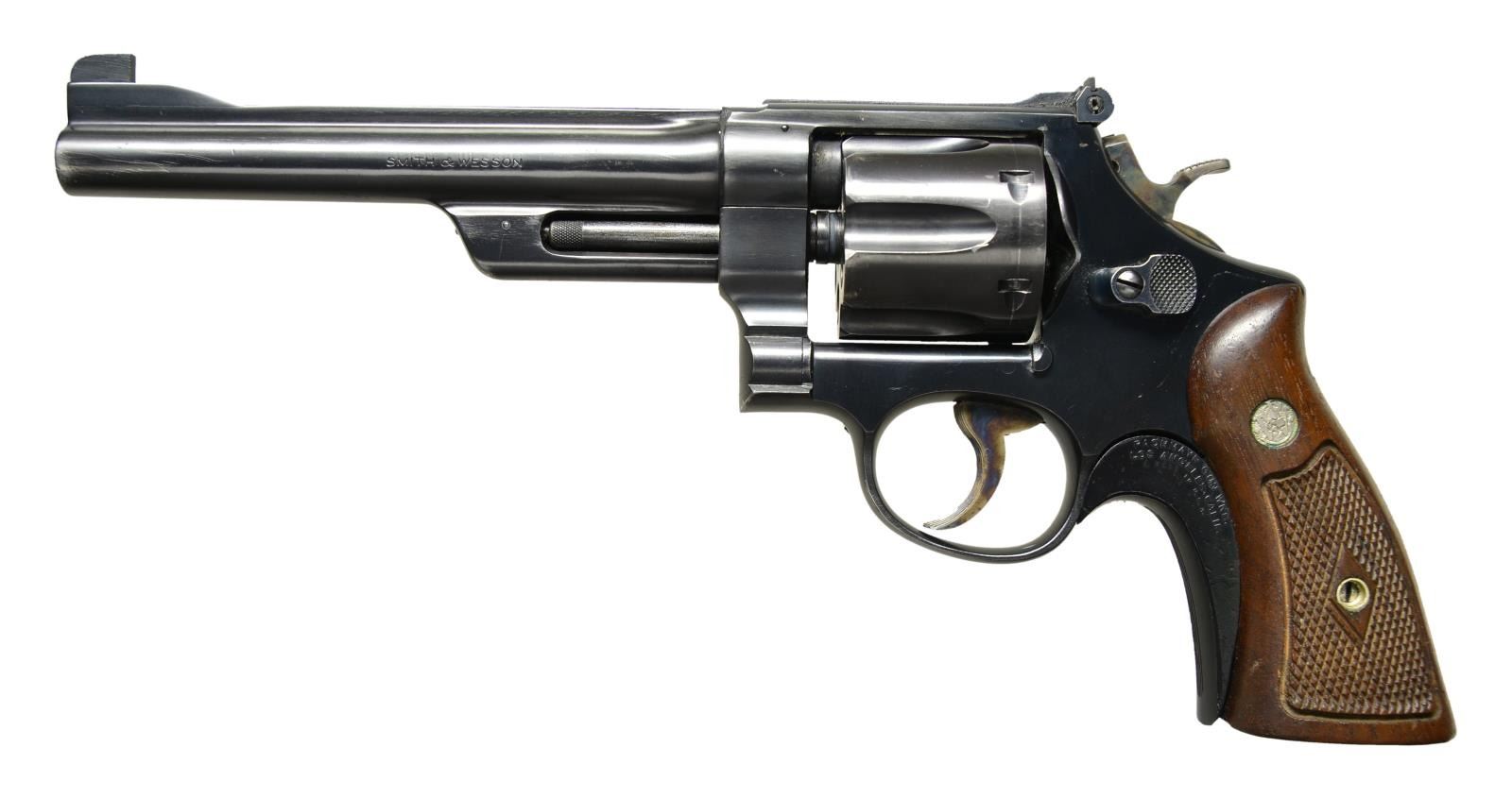 Cal.38 S&W Special. S# S98488. Bbl.6.5". Manufactured 1953-1954. Double action, N-Frame, 5-screw revolver. Patridge front & micrometer click adjustable rear sights. 6-shot fluted cylinder. Serrated top barrel rib. Blued finish. Shrouded ejector rod. Checkered hammer spur & cylinder release. 6 groove serrated backstrap & front strap. Matching numbers on frame, barrel, cylinder & ejector. Checkered hardwood grips w/ single diamond over screw & S&W medallion. Currently sporting Pachmayr grip spacer between trigger guard & grips. CONDITION: Complete & consistent finish coverage w/ scattered thinning & light scratching as evidence of prior use. Grips illustrate use w/ a few light impressions & squared checkering. Bore is bright w/ strong rifling. (22-6072/JZ). CURIO. $500-700.