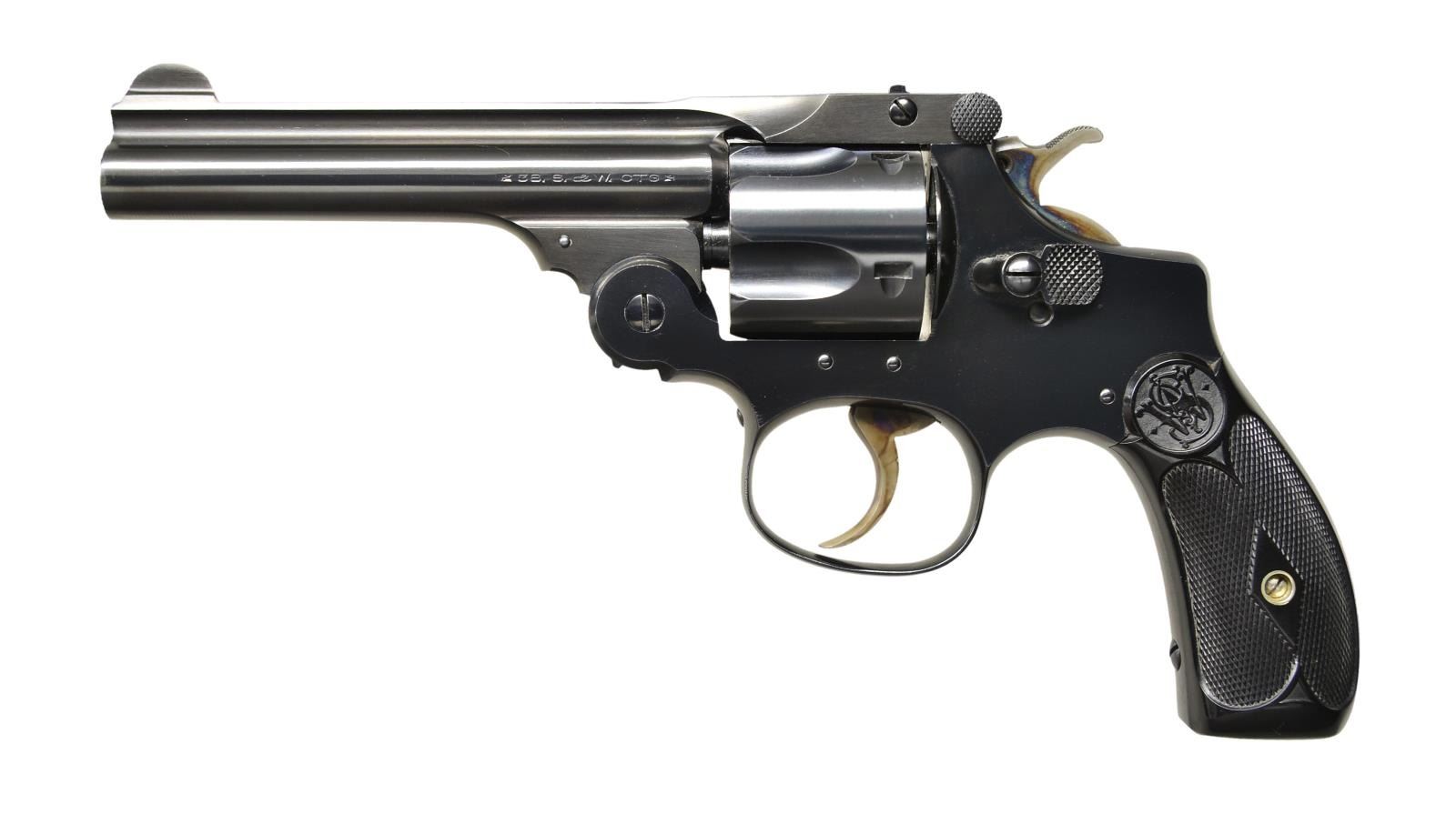 REVOLVER. Cal.38 S&W. S# 54507. Bbl. 4". Mfg. 1909-1920. Double action w/ 5-shot fluted cylinder. S&Ws last top break revolver to be introduced. Forged round blade front & short, raised rear sight on raised portion of top strap release. Blued finish on exposed metal surfaces. 2 piece black plastic, checkered grips w/ S&W logo on top. Checkered hammer spur & cylinder release. CONDITION: Blued finish enjoys complete & consistent coverage w/ very little evidence of early use. All markings are clear & crisp. Grips are in very nice condition w/ little sign of previous wear or use. Bore is bright w/ strong rifling. (22-6073/JZ). CURIO. $300-500.