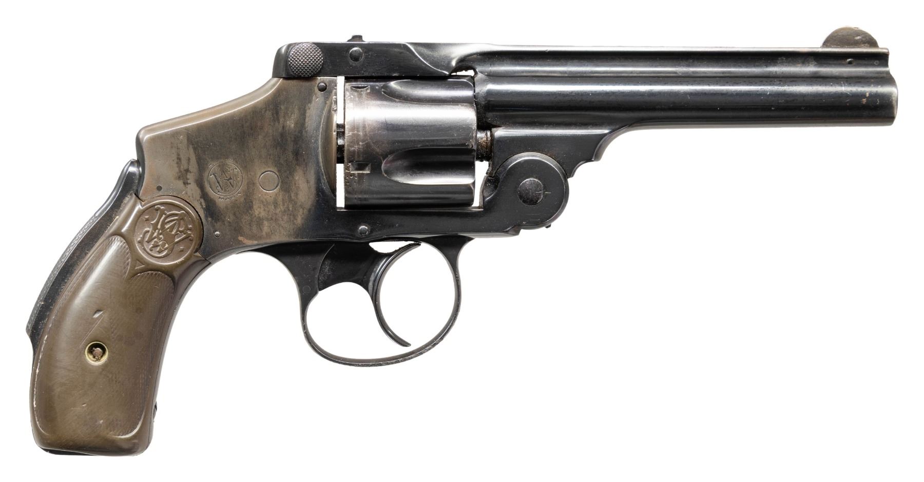Cal 38 S&W. S# 157217. Bbl. 4". Round blade front sight. Fixed u-notch rear sight. Matching numbers on frame, bbl. latch & cyl. 5-shot cyl. 4th Model 38 Safety Hammerless revolver. Reblue finish. Checkered hard rubber grips with matching scratch numbered right panel & S&W monograms. CONDITION: grips show a large chip missing at bottom of both panels, overall heavy worn checkering, some dings & handling marks. Metal retains 50% old reblue with a few notable patches of cleaned pitting, scattered fading to gray, areas turning a silver color, edge wear, further light pitting & some oxidation. Action appears functional when hand cycled. Bore shows scattered oxidation & some pitting but evident rifling. (25-4295/MJC). CURIO. $150-250.