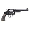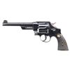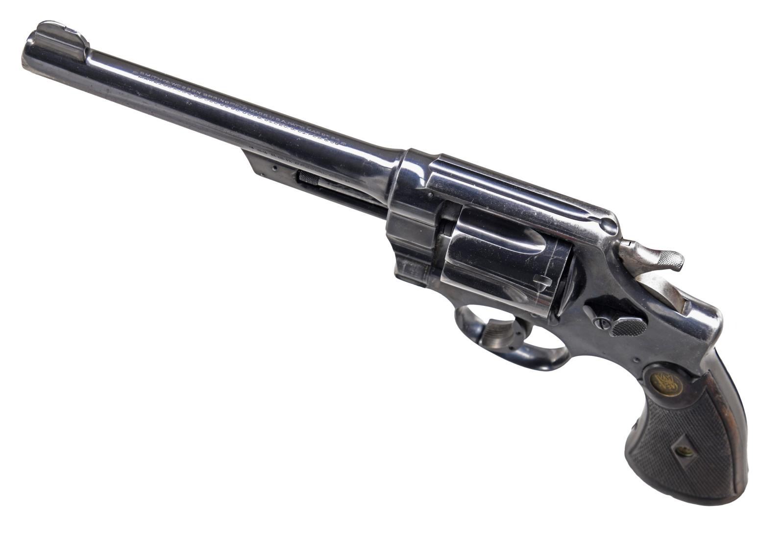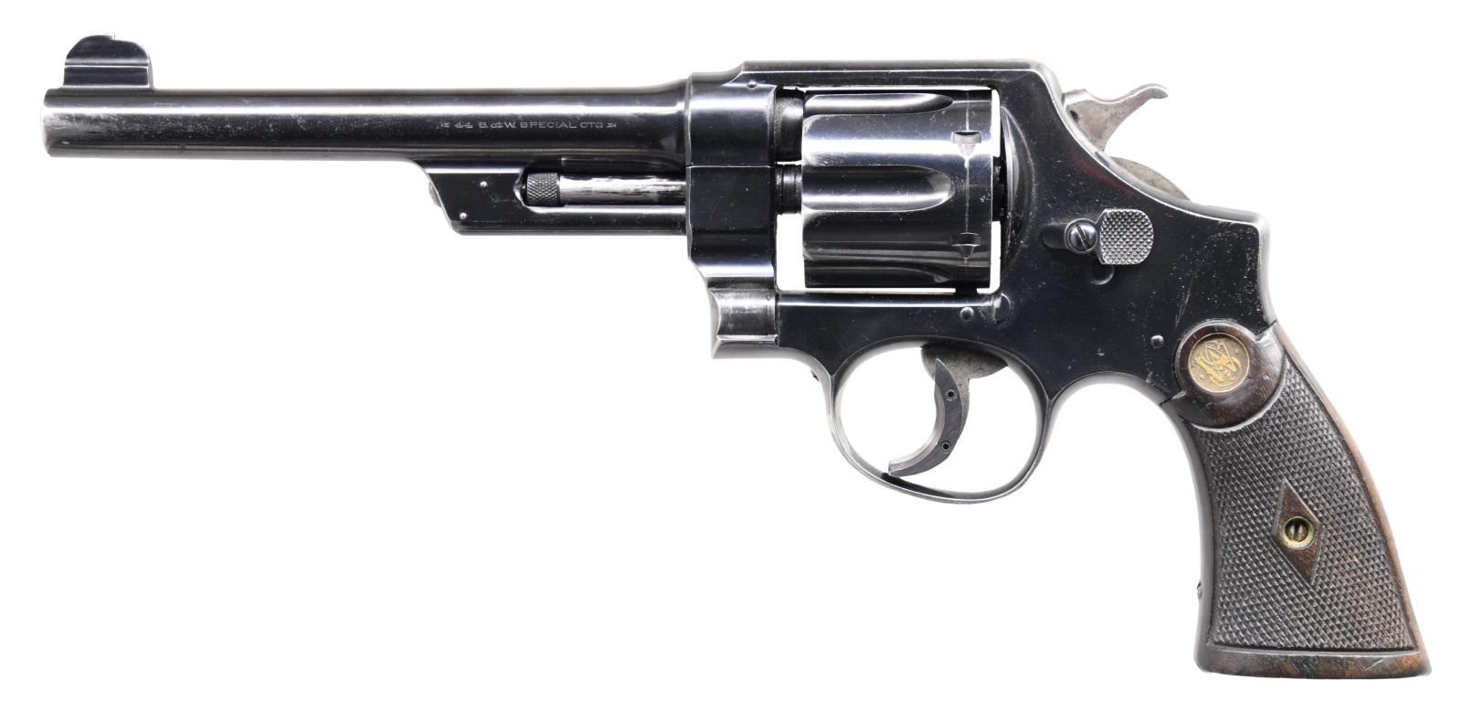 LOCK DA REVOLVER. Cal. 44 S&W Spl. S# 6473. Bbl. 6 1/2" round with blade sight. Six-shot fluted cyl. A third lock at the crane, giving it its unique name. Five-screw action with a pinned bbl. and shrouded ejector rod. Blue finish with a case-colored hammer and trigger. The trigger is fitted with an aftermarket-wide shoe. The butt of the gun near the serial number has a star factory rework mark. Two-piece walnut diamond checkered square butt service grips with S&W medallions. 15,375 mfg. 1907-15. CONDITION: over 80% lightly worn, reblued finish showing muzzle and carry wear with scattered handling marks. Grips have an age-darkened, worn appearance with dents and marks. The front sight has an added sighting notch. The dark, pitted bore retains intact rifling. PROVENANCE: from the collection of Curtis H. Halvorson. (23-5870/DS). CURIO. $1,000-1,500.