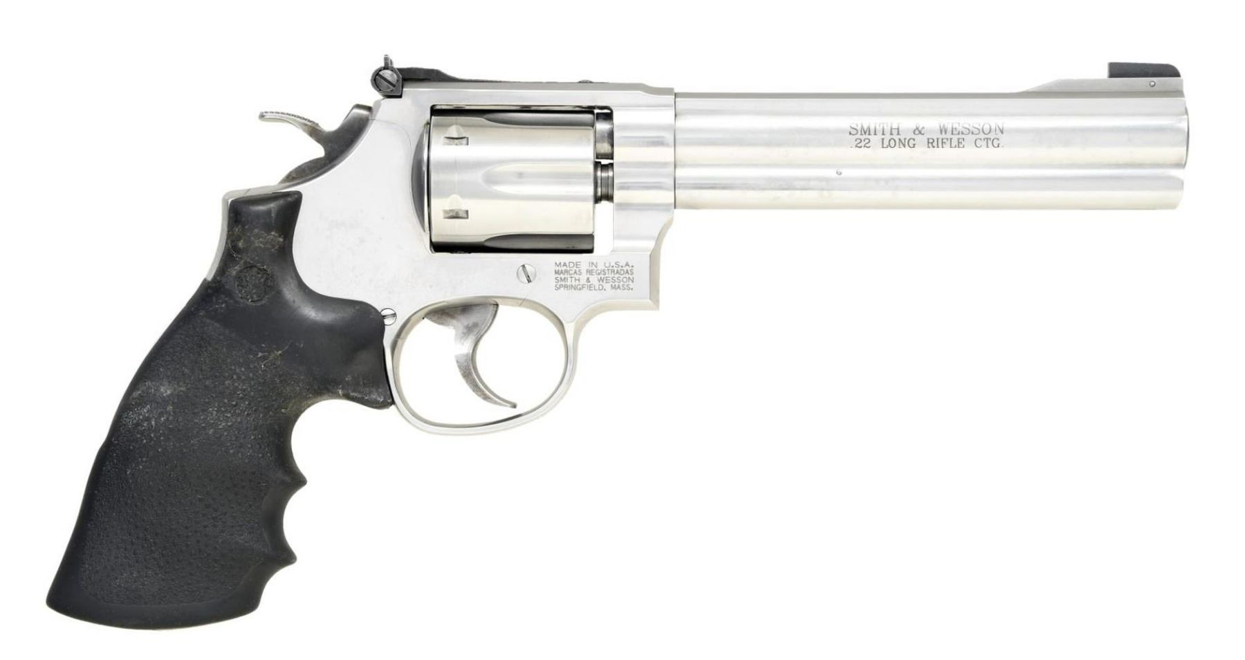Cal. 22 LR. S# CEY3133. Bbl. 6" w/ full underlug. Blade front sight. Adjustable rear sight. Hammer is a bit sluggish when used in single action. Stainless finish. Hogue Monogrip. UNATTACHED ACCESSORIES: unnumbered factory hardcase w/ foam inserts & manual. CONDITION: all aspects rate very good plus or better w/ some light scratches & scattered handling wear. (23-4940/MJC). MODERN. $600-900.