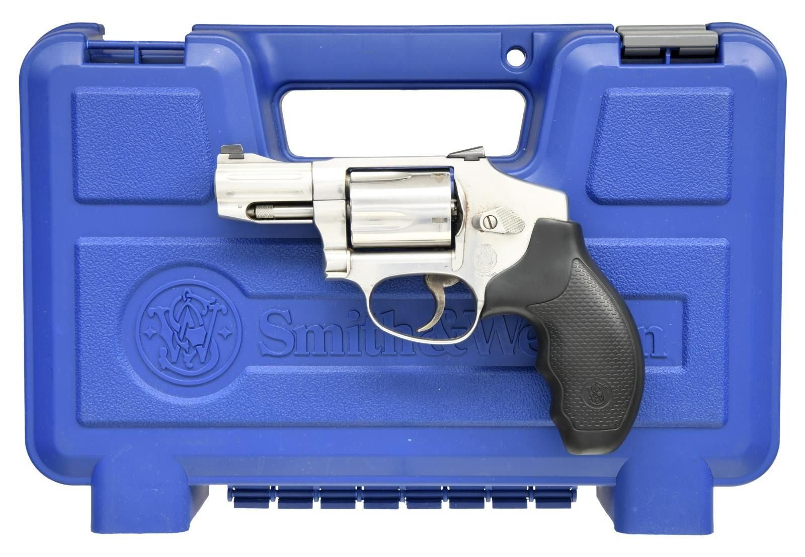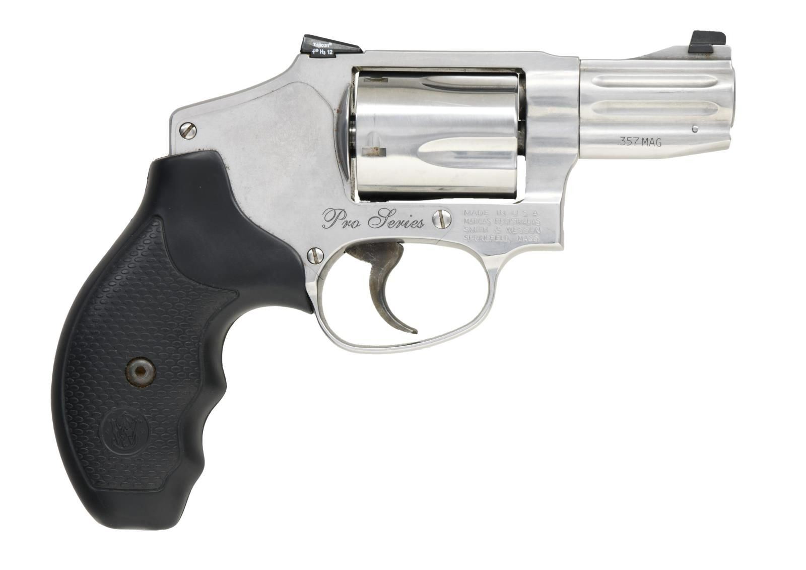 Cal. 357 Mag. S# CTF3412. Bbl. 2 1/8". Trijicon three-dot night sights that have mostly lost their glow. Stainless finish. No internal lock on this model. S&W rubber grips. UNATTACHED ACCESSORIES: blue factory hardcase matching numbered to gun that is missing a latch w/ fired case, foam inserts & paperwork. CONDITION: all aspects rate very good or better w/ operational & carry wear. (23-2631/MJC). MODERN. $600-900.