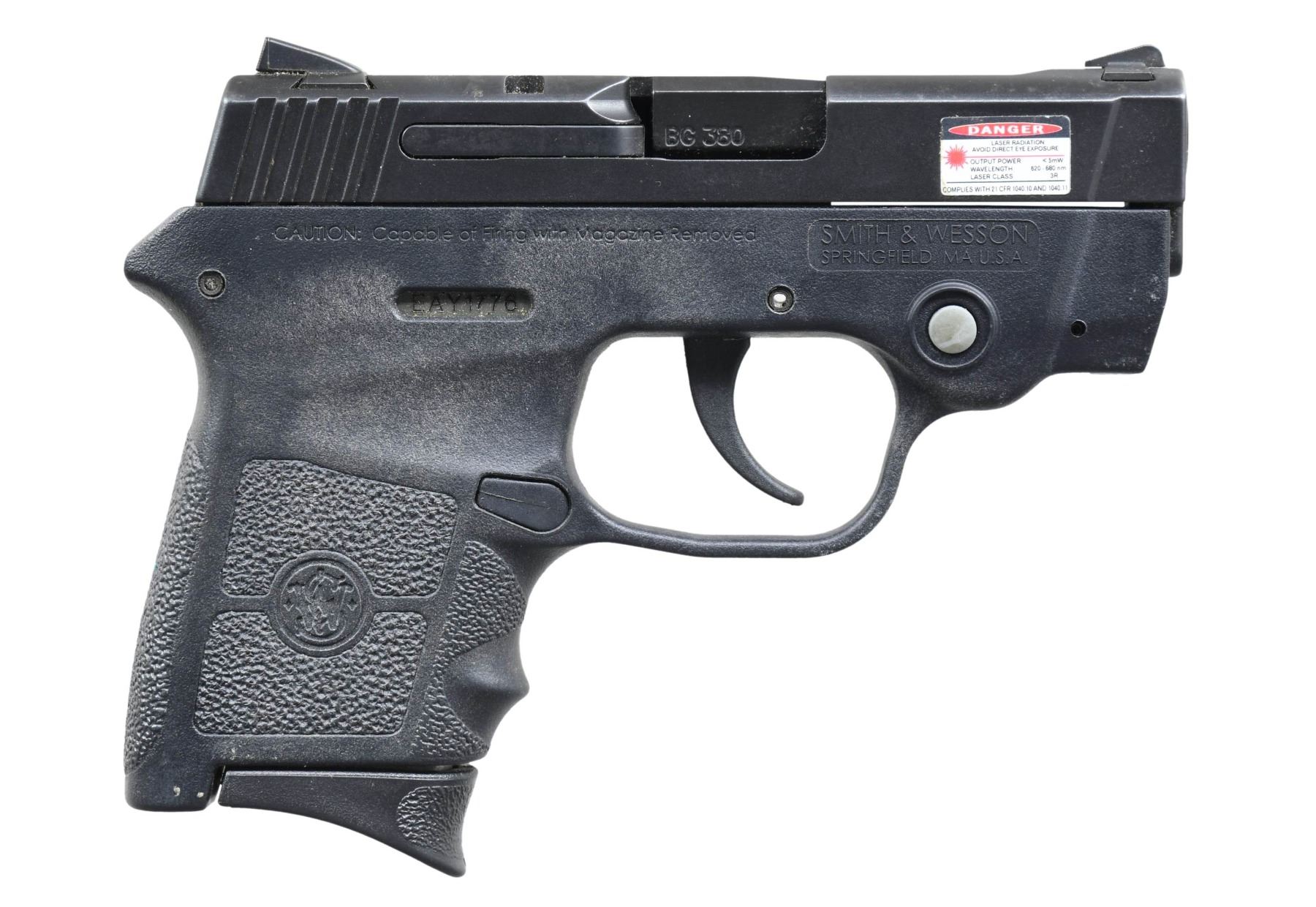 Cal. 380 ACP. S# EAY1776. Bbl. 2 3/4". Blade front sight. Square notch rear sight. Pistol has Insight red laser that appears to work but laser is very faint. Matte black finish. Polymer frame. MAGS: 1-6 rd. UNATTACHED ACCESSORIES: DeSantis leather holster. CONDITION: frame shows some scattered handling wear. Slide shows scattered light edge & handling wear. Action functions properly when hand cycled. Very good plus bright bore. (25-3185/MJC). MODERN. $250-350.