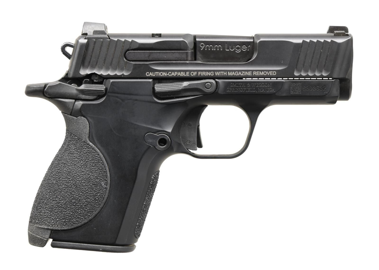 Cal. 9mm Luger. S# SBD3632. Bbl. 3". Three dot sights. Matte black finish. Ambi safety & slide release. Polymer frame. MAGS: 1-10 rd. UNATTACHED ACCESSORIES: w/ box. CONDITION: all aspects rate very good plus or better w/ some light handling wear. PROVENANCE: The Collection of Gun Sport Ltd owned by Jon R. Thomas. (23-4538/MJC). MODERN. $300-500.