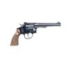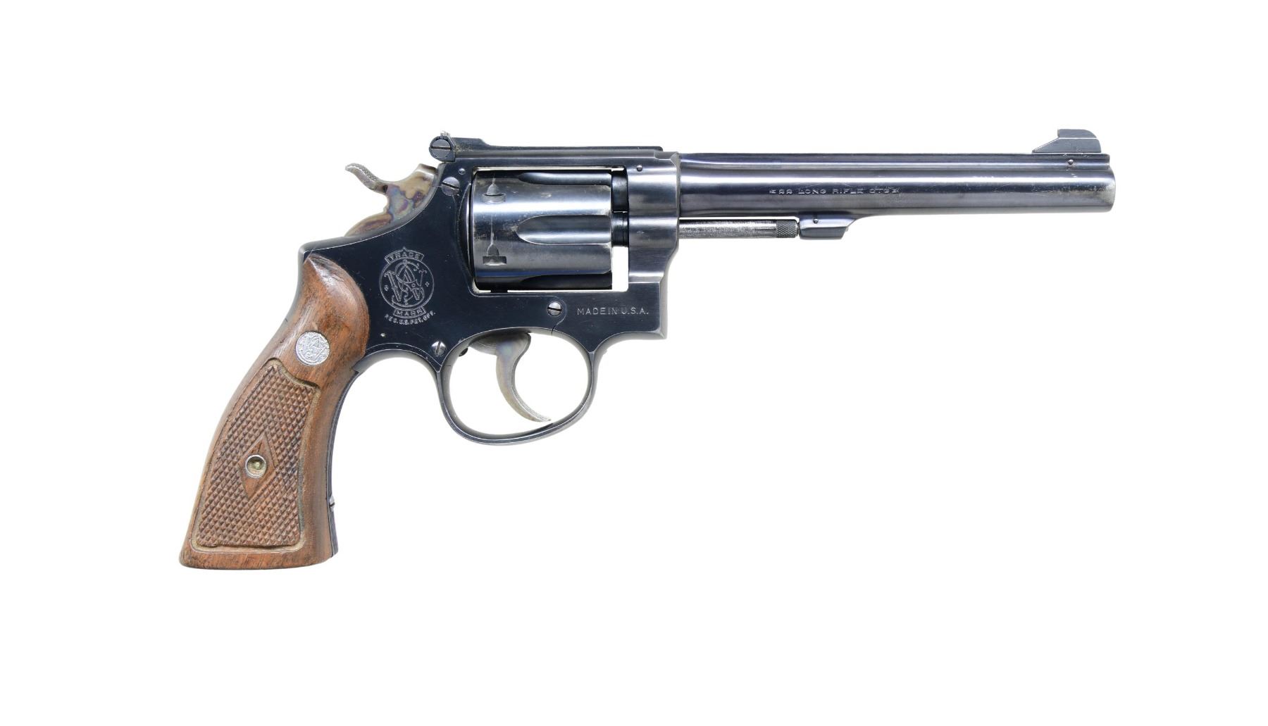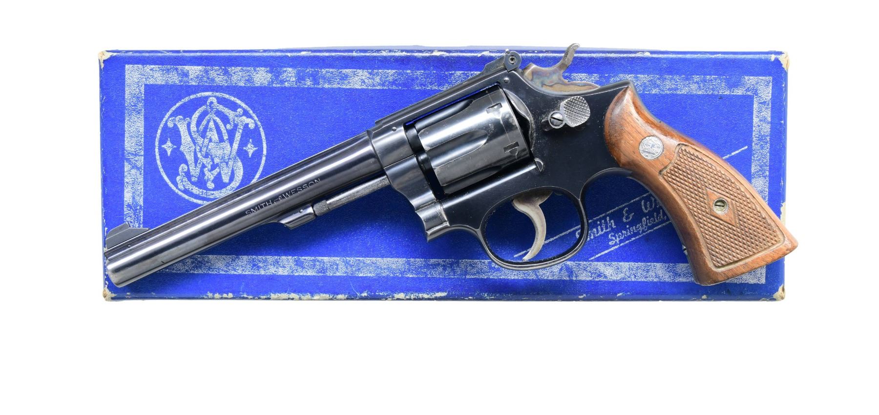 DA REVOLVER WITH FACTORY BOX. Cal. 22 LR S# K16625 (mfg. 1947). Configuration includes a blued finish, 6-inch barrel, pinned Patridge front sight, and Micrometer adjustable rear sight. The revolver has a standard hammer and trigger with a square butt frame. The matching cylinder holds 6 rounds and is fluted; matching extractor. Grips are checkered walnut with S&W medallions. UNATTACHED ACCESSORIES: factory box with screwdriver & cleaning rod. CONDITION: approx. 90% of an old professional blued refinish remaining on the barrel and frame, showing wear, marks & spots of cleaned oxidation. Grips are in fair condition with worn finish and wear to checkering. Bore is bright with strong rifling. (24-4870/MD). CURIO. $550-750.