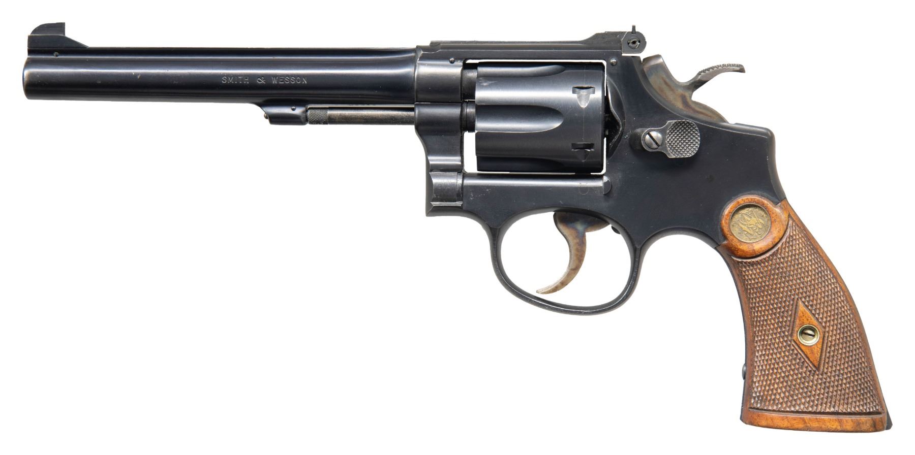Cal. 22 LR. S# K213468. Bbl. 6" pinned. Patridge front sight. Adjustable square notch rear sight. Matching numbers on frame, bbl., cyl. & extractor. Five-screw K22 Masterpiece made in 1954. 6-shot recessed cyl. Blued finish with case colored hammer & trigger. Unnumbered checkered walnut diamond center grips with gold S&W medallions. CONDITION: grips show shallow chips at rear of both panels & scattered handling marks. Hammer & trigger retain most of their case colors with some light operational wear. Balance of metal retains 95% factory quality blue with some fading on trigger guard, some light oxidation, some edge & operational wear. Action functions properly when hand cycled. Bright near excellent bore. PROVENANCE: Estate of Lloyd Robinson. (25-6684/MJC). CURIO. $400-600.