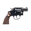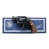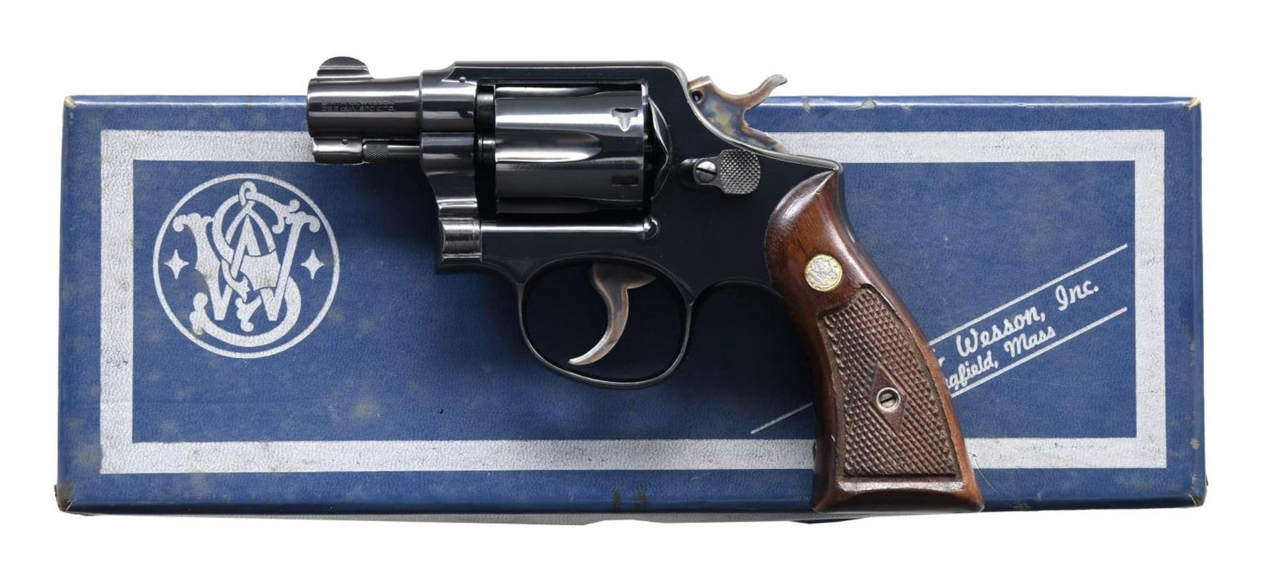 Cal. 38 Spl. S# C320623. Bbl. 2". Round blade front sight. Fixed rear sight. Mfg. 1954-56. Action functions well when hand cycled but cyl. latch can be stiff. Blue finish w/ case colored trigger & hammer. Checkered walnut magna grips w/ silver S&W medallions. Right grip panel is stamped matching numbered to frame. UNATTACHED ACCESSORIES: mismatched replacement S&W Model 10-5 box w/ manual. CONDITION: grips show some dings & handling marks. Trigger & hammer retain most of their case colors w/ some light oxidation & operational wear. Balance of metal retains 95-97% blue w/ a drag line on cyl., some handling wear & light scratches. Very good bright bore. (23-5233/MJC). CURIO. $400-600.