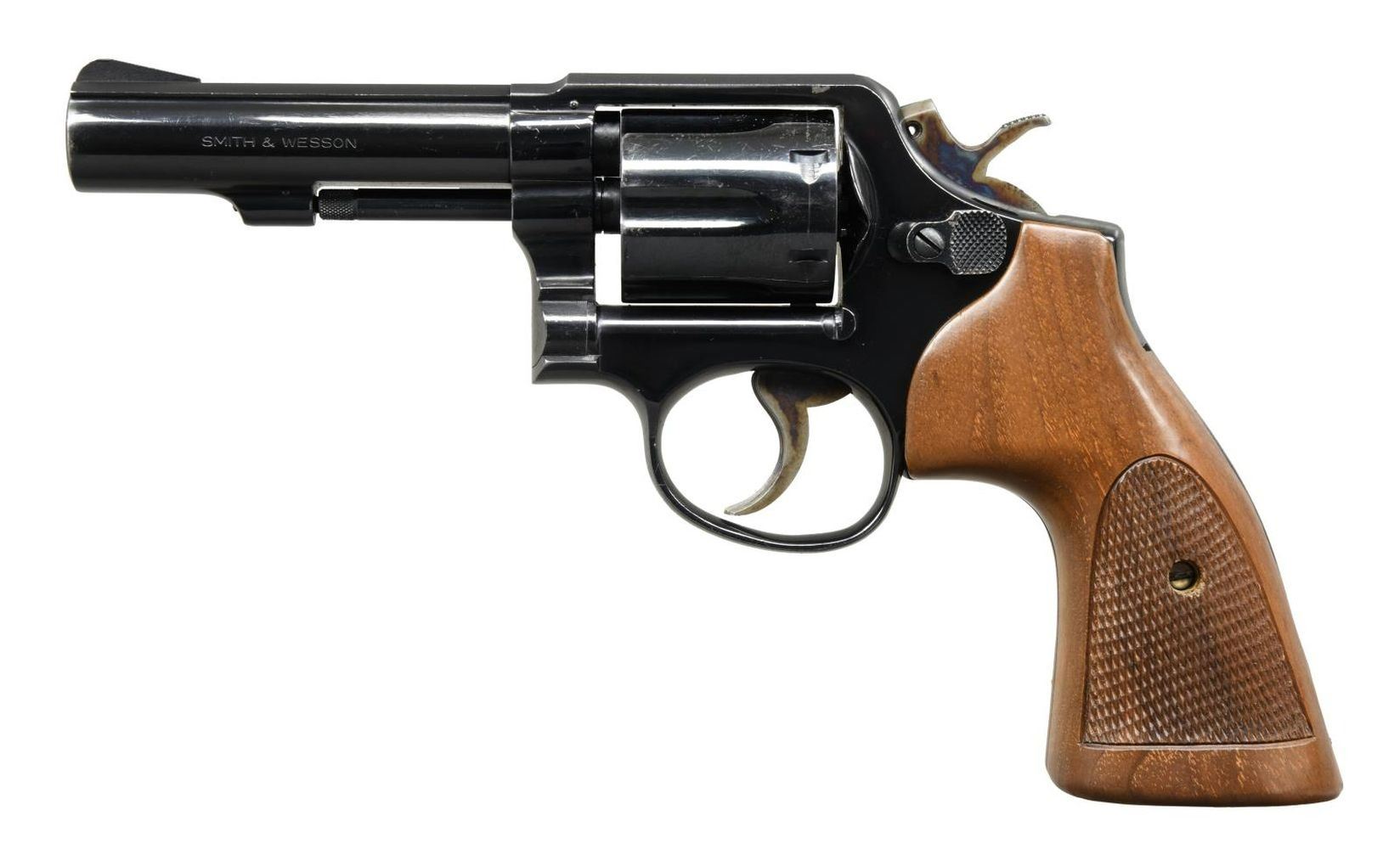 Cal. 38 Spl. S# D589524. Bbl 4". Model 10-6 manufactured by Smith & Wesson. Left side of barrel is marked "SMITH & WESSON", with the caliber designation stamped across the right. Right side of frame is stamped with S&W's trademark logo, followed by their manufacturer information. Metal components are blued, with the frame being mounted with 2 piece checkered wood aftermarket grips. Serrated ramp front sight with frame square notched rear sight. CONDITION: metal components retain the majority of their blue finish, exhibiting mild wear, scattered superficial handling marks, as well as cleaned spots of oxidation that are primarily present on the cylinder. Mirror bore, exhibiting strong rifling throughout. Grips show a few scattered handling marks, with a couple of impressions on the butt. (23-2676/MLW). MODERN. $350-550.