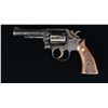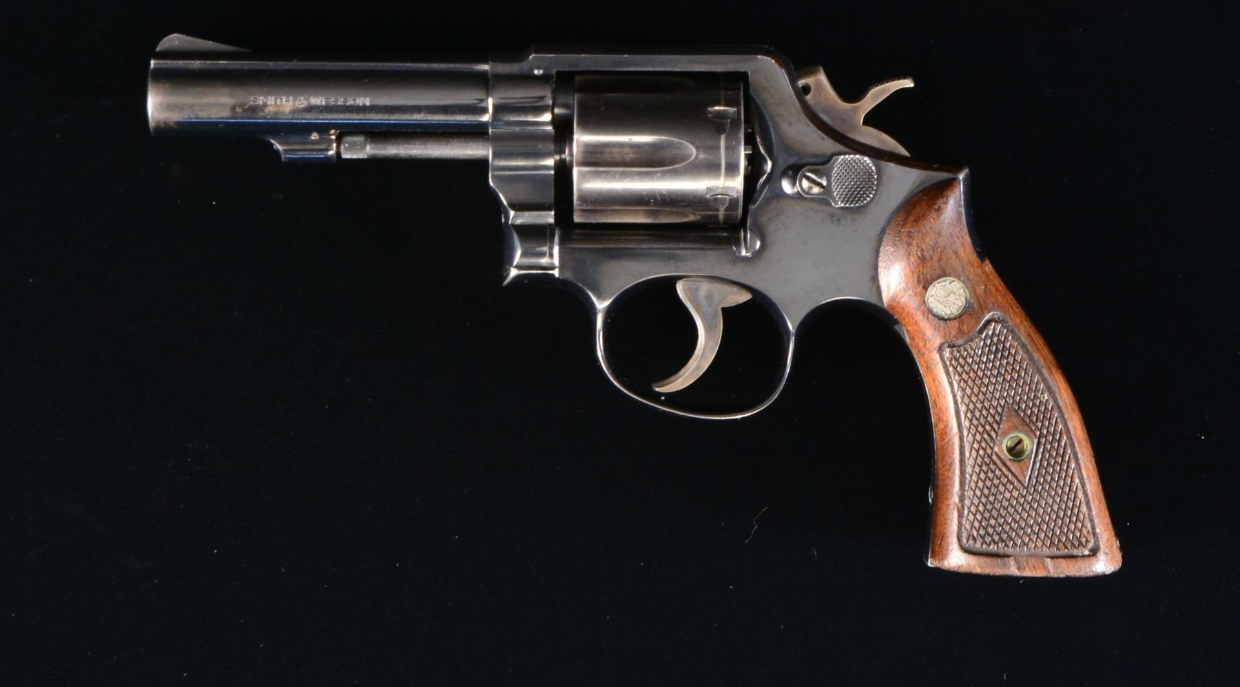 Cal. 38 Spl. S# D459969. Bbl. 4" heavy w/ rib & serrated ramp front sight. 6 Shot fluted cyl. Blue finished 3 screw action w/ pinned bbl. Case colored hammer & serrated trigger. 2 Piece diamond checkered walnut Magna grips w/ S&W medallions. CONDITION: 80% blue showing edge wear & cyl. drag line. Grips are dark showing checkering wear w/ dents at butt, left panel is chipped at butt. Bore is bright w/ strong rifling. (20-841/DS). MODERN. $300-400.