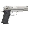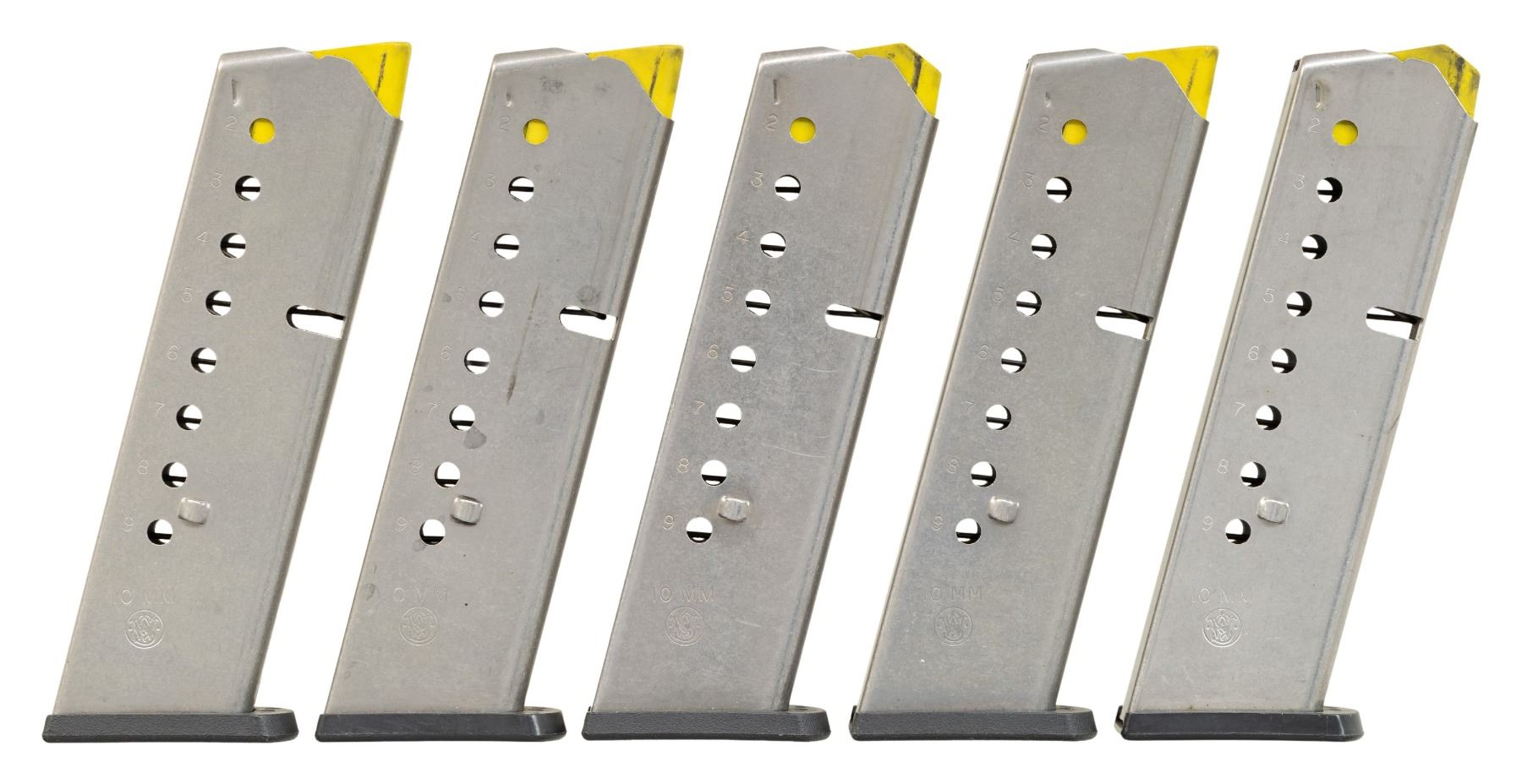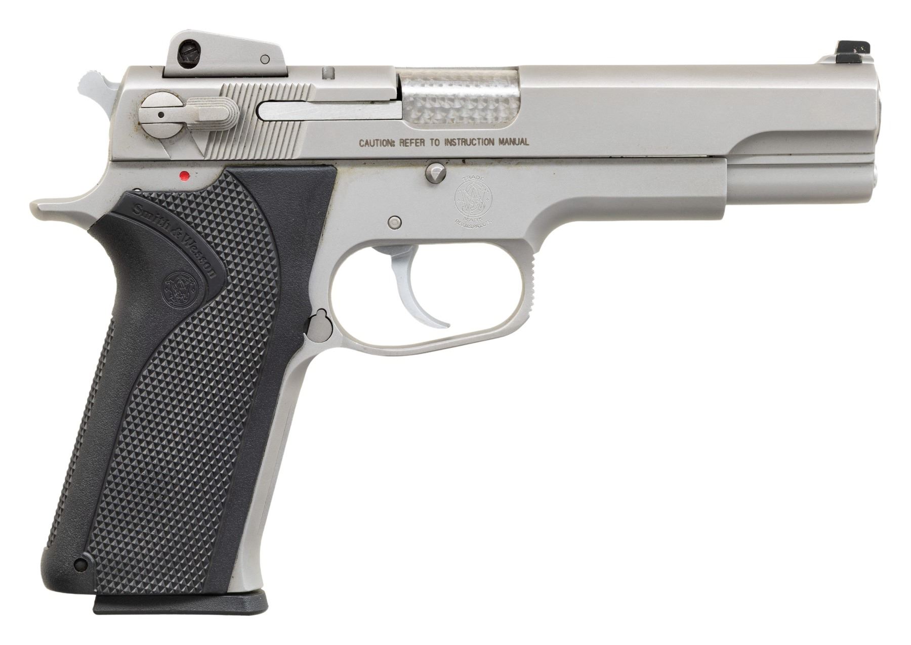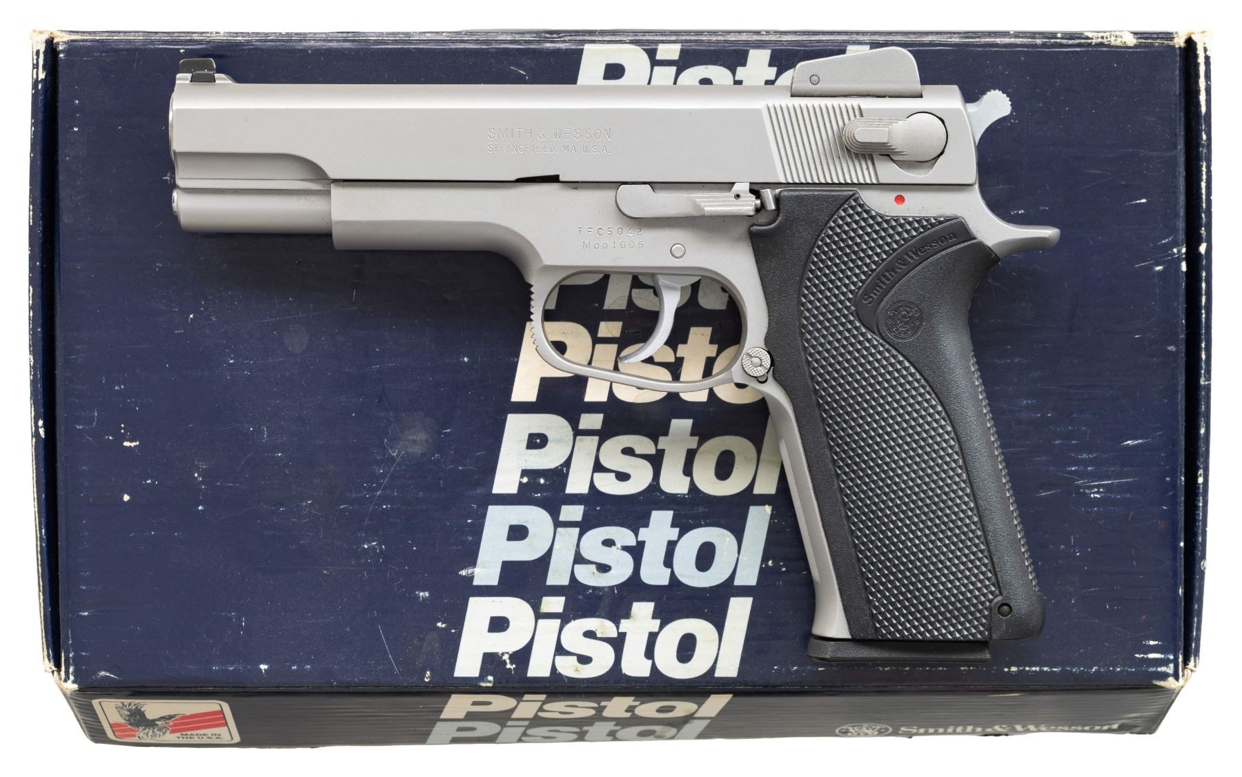 Cal. 10mm. S# TFC5042. Bbl. 5". Three dot sights with adjustable rear. Single stack 3rd Gen S&W auto pistol. Ambi safety that also acts as a decocker. Stainless finish with bbl. having a jeweled appearance at ejection port. Checkered black grips with S&W monograms. MAGS: 6-9 rd. factory. UNATTACHED ACCESSORIES: matching numbered factory box with cleaning kit. CONDITION: grips & metal show scattered light handling marks & usage wear. Action functions properly when hand cycled. Bright near excellent bore. (25-4893/MJC). MODERN. $400-600.