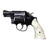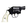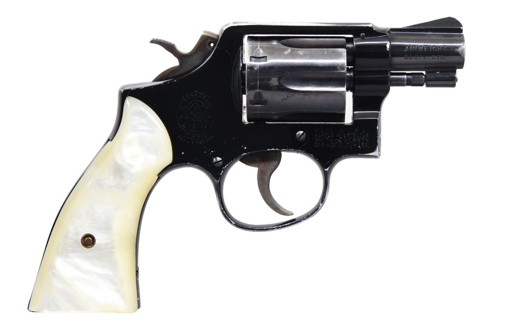 Cal. 38 Spl. S# C739574. Bbl. 2" pinned. Ramped serrated blade front sight. Fixed rear sight. Mfg. 1963-1965. Airweight revolver with blued cyl. Flat latch. Case colored trigger & hammer. Plastic pearl style grips. CONDITION: grips show some light handling wear. Trigger & hammer retain most of their case colors with some operational wear & oxidation specks. Balance of metal retains 80% original anodized & blued finishes with some light pitting at muzzle, scattered flaking, edge & operational wear. Action functions properly when hand cycled. Bright near excellent bore. PROVENANCE: From the Lifelong Collection of George Staden S&W Member #3451. (25-90/MJC). CURIO. $250-350.
