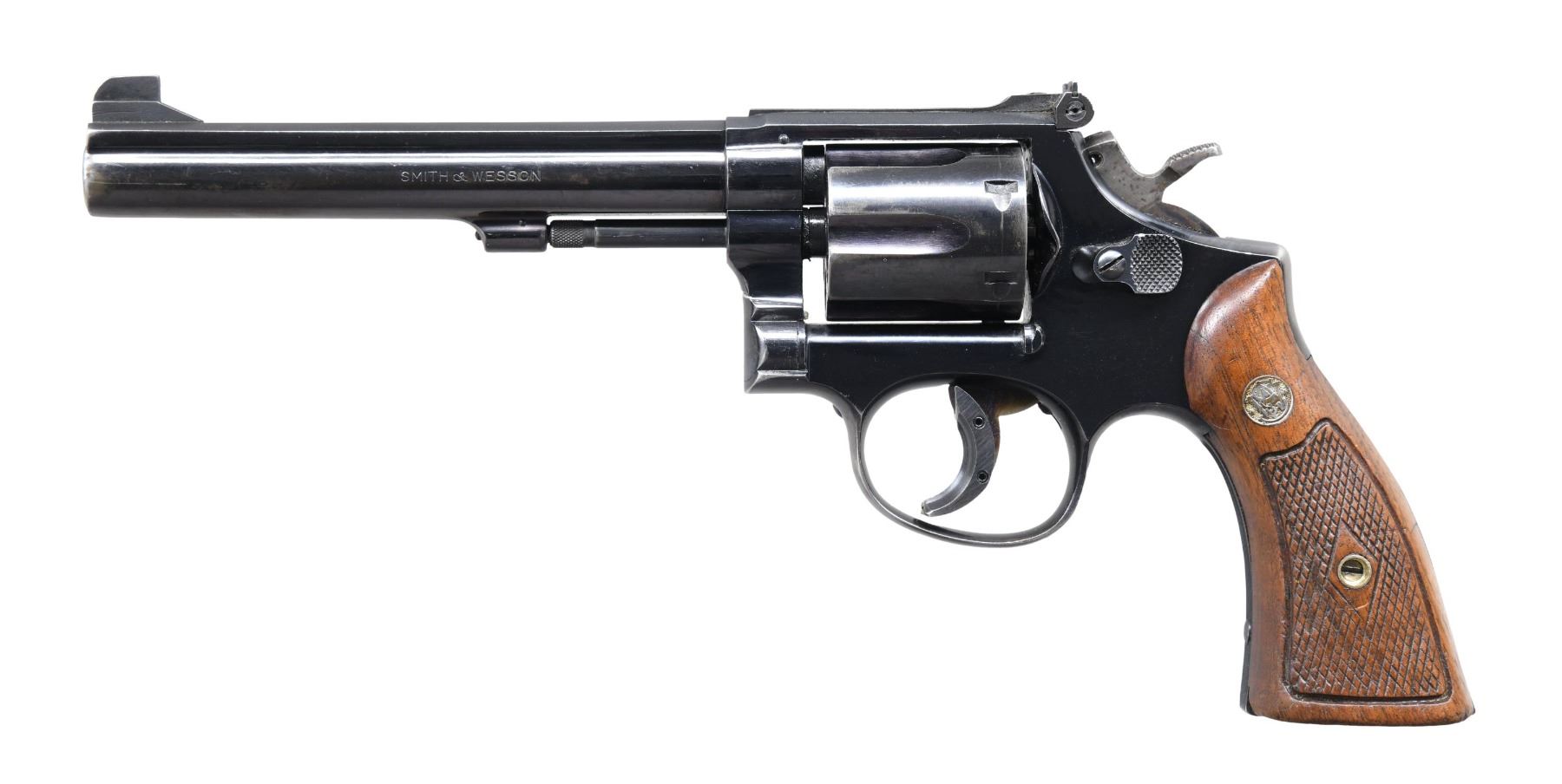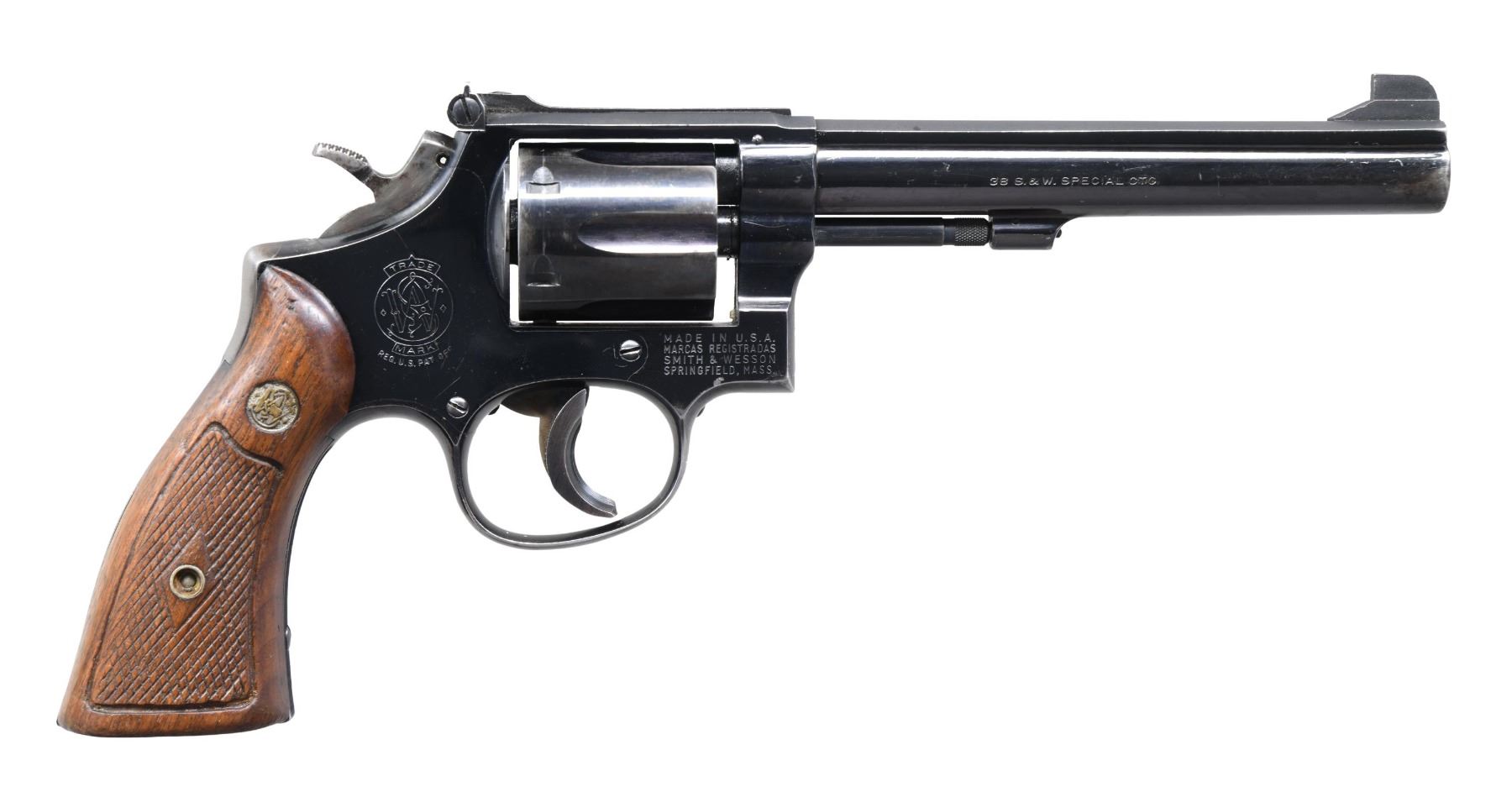Cal. 38 Spl. S# K431386. Bbl. 6" pinned. Patridge front sight. Adjustable square notch rear sight. Mfg. 1961. Blued finish with case colored trigger & hammer. Trigger has added shoe. Checkered walnut grips with matching numbered right panel & silver S&W medallions. CONDITION: front of right grip panel shows a small light chip, grips otherwise show checkering wear, some dings & handling marks. Trigger & hammer retain strong amounts of case colors with scattered fading to gray & some oxidation. Balance of metal retains 70% original blue with scattered edge wear, fading to gray most notably on bottom of trigger guard & some handling marks. Action functions properly when hand cycled. Bright near excellent bore. PROVENANCE: From the Lifelong Collection of George Staden S&W Member #3451. (25-92/MJC). CURIO. $500-800.