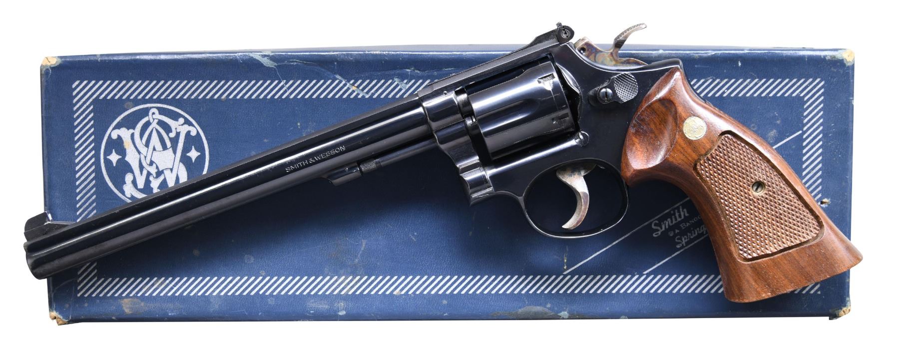 Cal. 38 Spl. S# 8K36890. Bbl. 8 3/8", pinned. Patridge front sight. Adjustable square notch rear sight. Mfg. 1975. Blued finish with case-colored target hammer and trigger. Checkered walnut target grips with silver S&W medallions. UNATTACHED ACCESSORIES: matching-numbered factory box in fair condition with manual, paperwork, and cleaning rod. CONDITION: Grips show scattered handling marks. Trigger and hammer retain strong amounts of case colors with some operational wear. Balance of metal retains 98% of its original blue, with some light handling and operational wear. Action functions properly when hand-cycled. Bright, near-excellent bore. PROVENANCE: From the lifelong collection of George Staden, S&W Member #3451. (25-93/MJC). MODERN. $500-800.