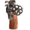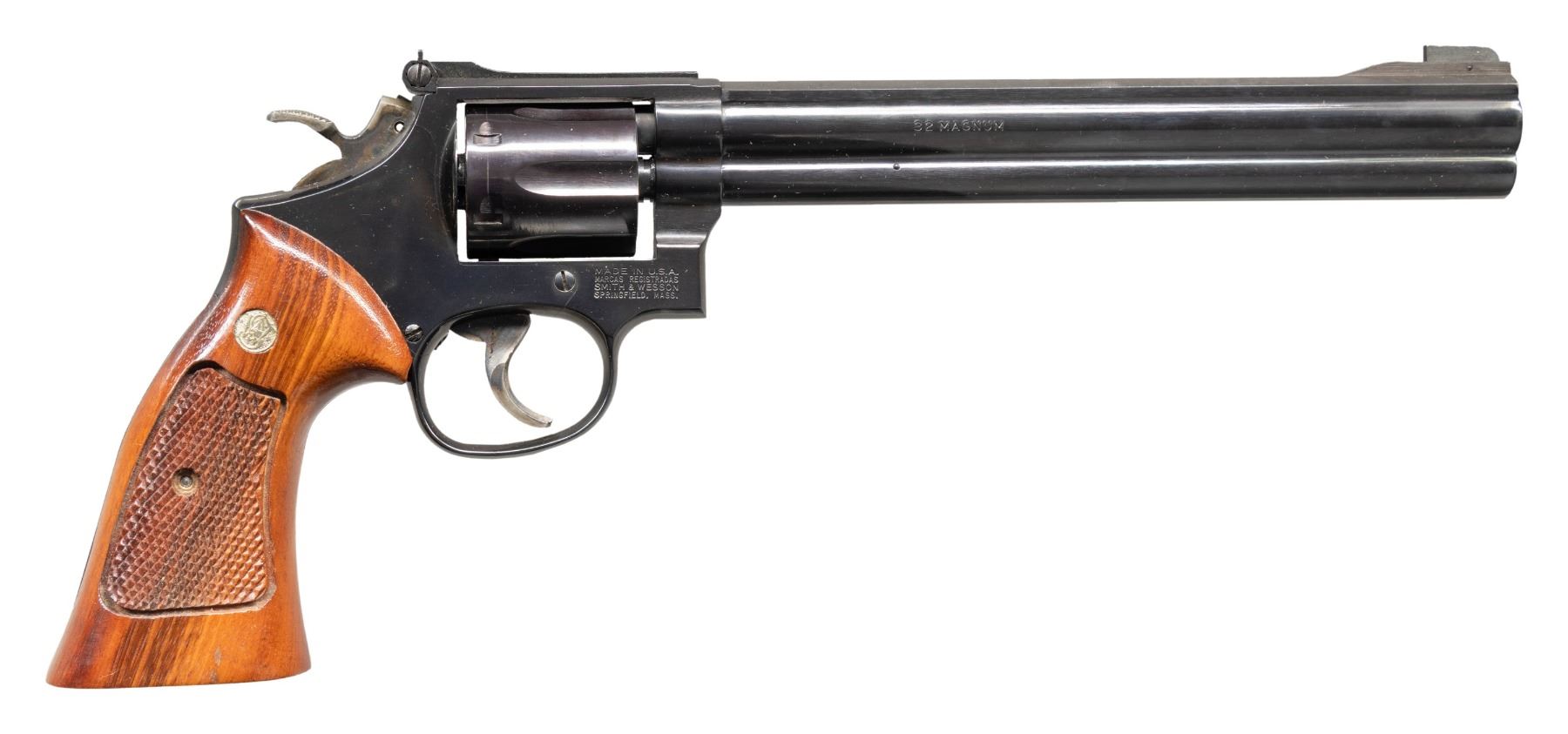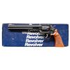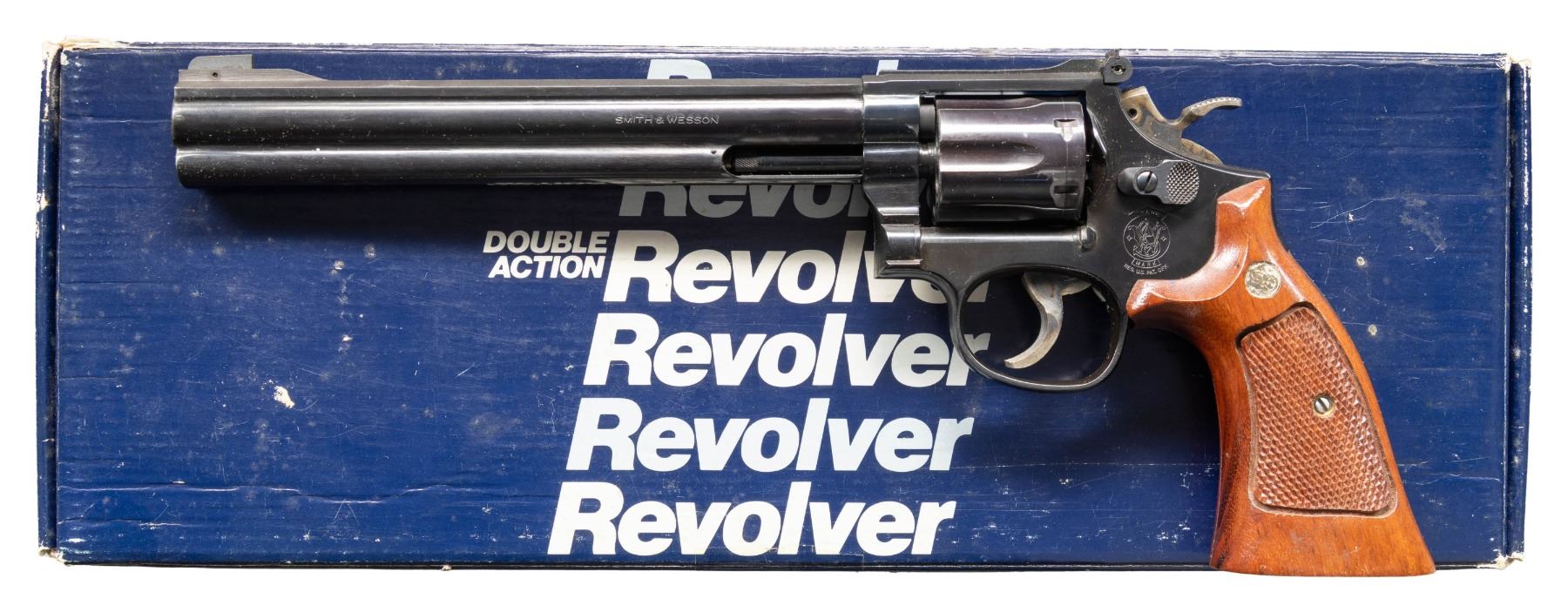 Cal. 32 H&R Mag. S# BFE8043. Bbl. 8 3/8". Ramped blade front sight. Adjustable square notch rear sight. Desirable 16-4 revolver with only 8800 of all bbl. lengths made between 1989-1992. 6-shot cyl. Blued finish with case colored target hammer & trigger. Checkered walnut target grips with silver S&W medallions. UNATTACHED ACCESSOIRES: matching numbered factory box with set of hardwood finger groove grips that have silver S&W medallions. CONDITION: grips show a couple light handling marks. Trigger & hammer retain most of their case colors with some operational wear & light oxidation. Balance of metal retains 98% original blue with some light handling & edge wear. Action functions properly when hand cycled. Bright near excellent bore. PROVENANCE: Estate of Groves Herrick. (25-5656/MJC). MODERN. $400-600.