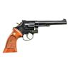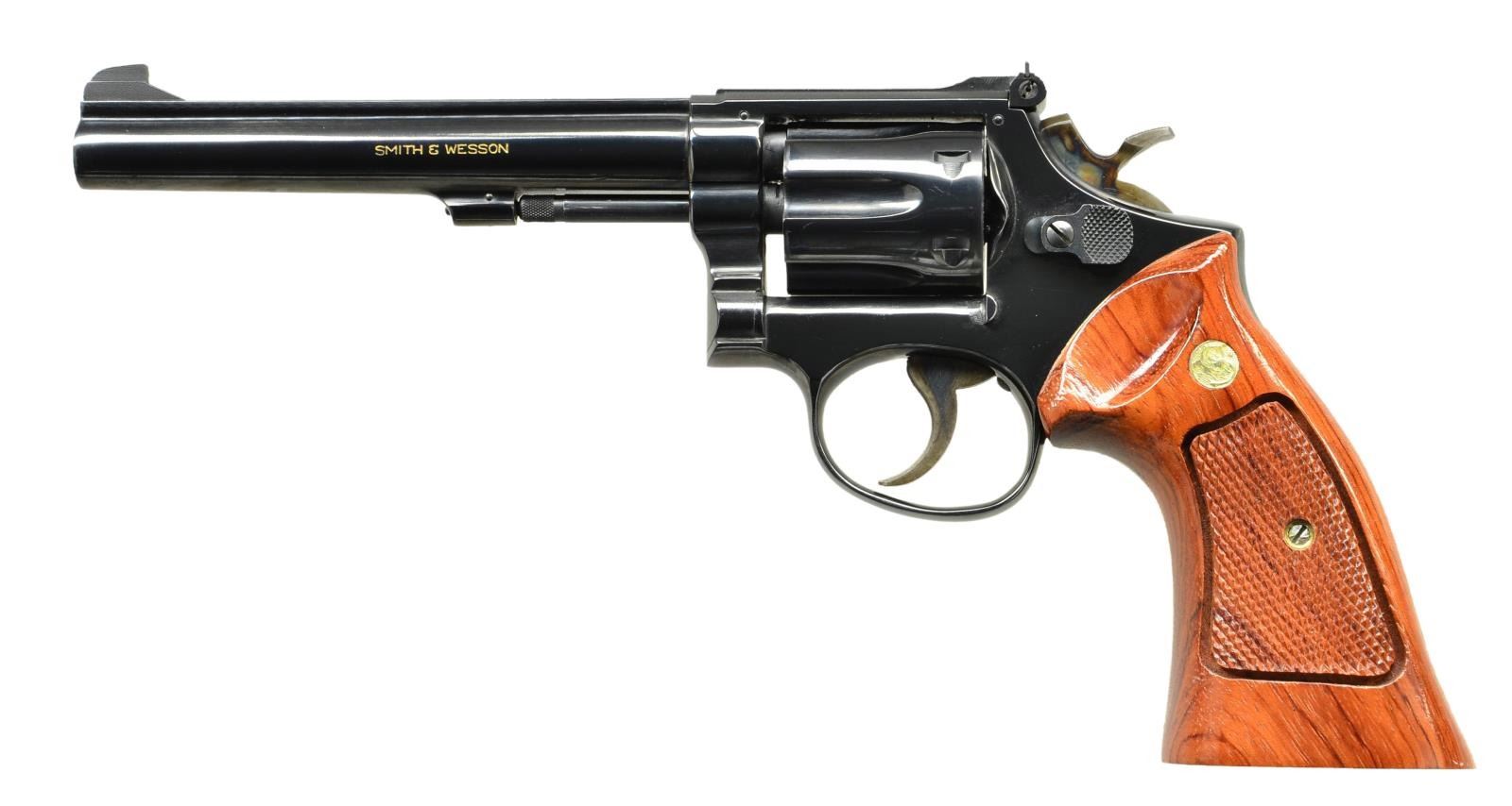 Cal. 22 LR. S# 8K40839. Bbl. 6". Mfg. 1975. Blued finish. Fixed ramp front sight w/ adjustable rear sight. Serrated flat top. Fluted cylinder. Checkered hammer spur & cylinder release. Serrated trigger, front and back straps. Gold colored inlay on factory markings. Checkered hardwood grips w/ gold S&W medallions. CONDITION: finish is complete & consistent w/ only gentle thinning at muzzle. Grips in beautiful condition still retaining sharp checkering. Bore is bright w/ strong rifling. (22-5983/JZ). MODERN. $600-900.