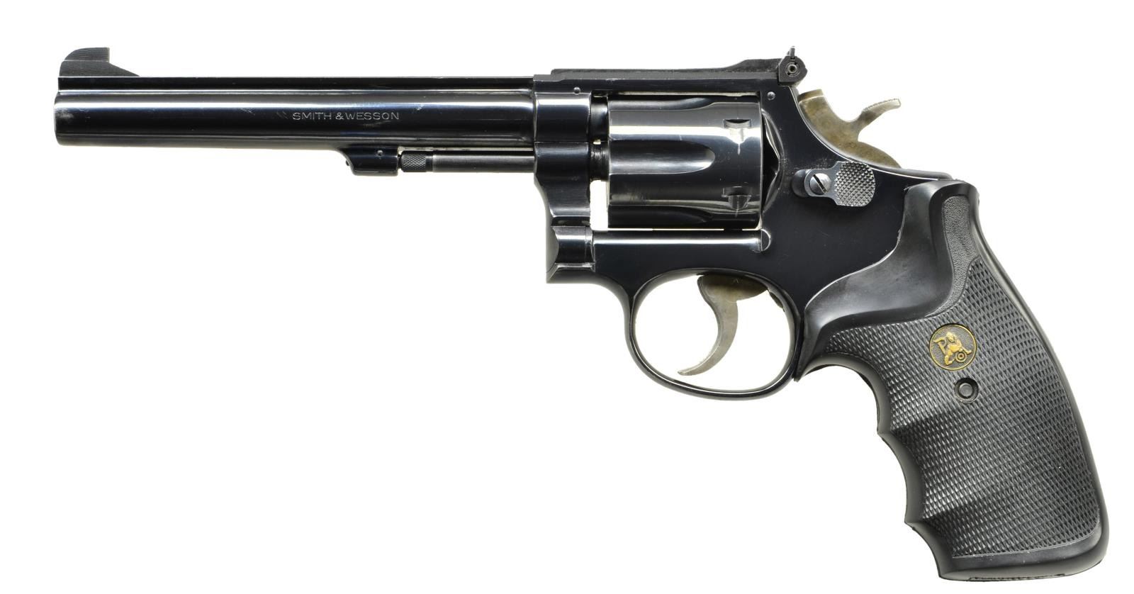 Cal. 22 LR. S# 85K4965 Bbl.6". Mfg.1980. Blued finish. 6-shot fluted cylinder. Square butt K Frame. Patridge front & micrometer click rear sights. 10-groove serrated back & front straps. Checkered hammer spur & cylinder release. Black rubber Pachmayr "Gripper" wrap-around grips. CONDITION: Blued finish enjoys complete & consistent coverage w/ light thinning at muzzle & in areas of mechanical intervention. Light drag line on cylinder. Bright bore w/ strong rifling. (22-6396/JZ). MODERN. $350-650.