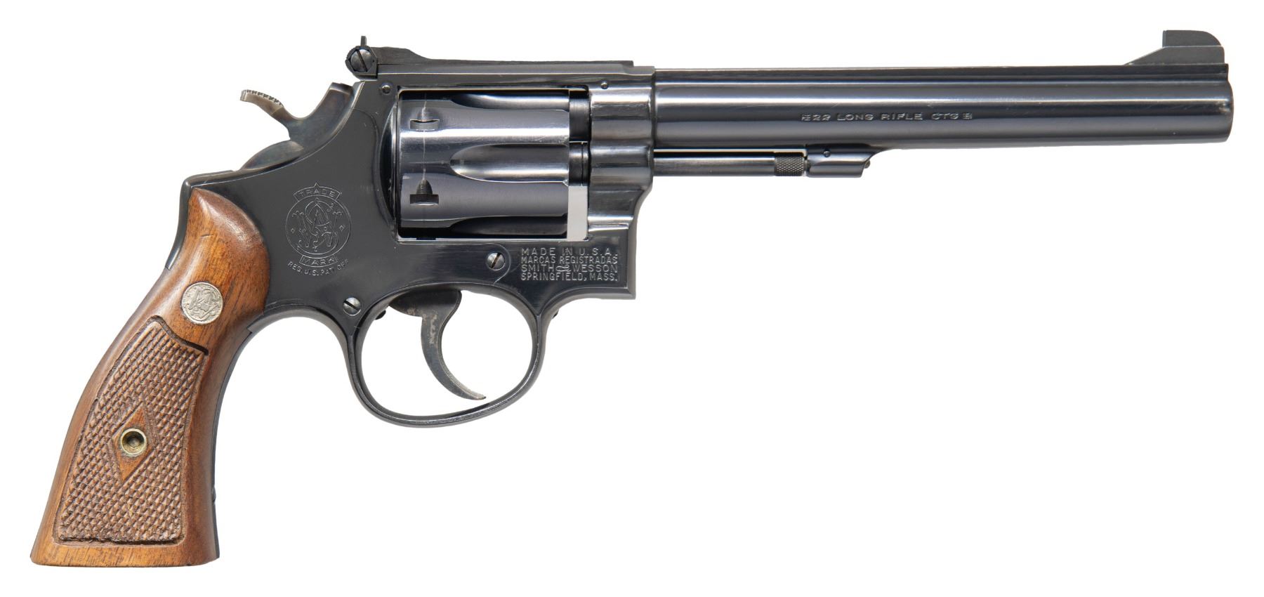 Cal. 22 LR. S# K379497. Bbl. 6" pinned. Patridge front sight. Adjustable square notch rear sight. No-dash Model 17 made in 1959. 6-shot recessed cyl. Blued finish with case colored hammer & trigger. Checkered walnut diamond center grips with matching numbered right panel, silver S&W medallions. CONDITION: grips show scattered handling marks & wear. Hammer & trigger are mostly a dull gray with strong traces of case colors & some oxidation staining. Balance of metal retains 95% original blue with some edge wear, light oxidation & fading. Action functions properly when hand cycled. Bright near excellent bore. PROVENANCE: Estate of Lloyd Robinson. (25-6683/MJC). CURIO. $500-700.