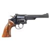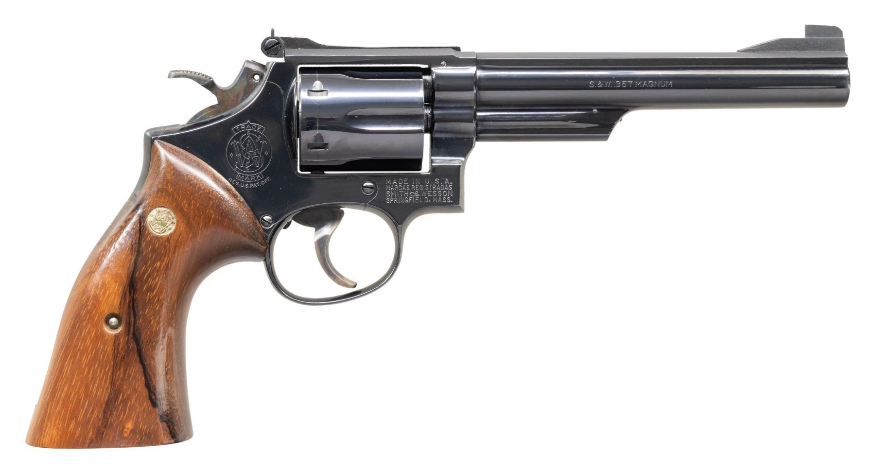 Cal. 357 Mag. S# K915593. Bbl. 6" pinned. Patridge front sight. Adjustable square notch rear sight. 1969 made 19-3 revolver. 6-shot recessed cyl. Blued finish with case colored target hammer & trigger. Smooth hardwood target grips with silver S&W medallions. CONDITION: grips have added varnish with some handling marks & wear. Hammer & trigger retain strong amounts of case colors with fading to gray & some operational wear. Balance of metal retains 95% original blue with some edge wear, handling marks & light oxidation on grip straps. Action is a bit sluggish but functional when hand cycled. Bright near excellent bore. (25-6007/MJC). CURIO. $800-1,200.