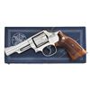 Cal. 357 Mag. S# 73K4710. Bbl. 4" pinned. Ramped serrated blade front sight with orange insert. Adjustable square notch rear sight with white outline. Nickel finish with case colored trigger & hammer. Checkered target grips with silver S&W medallions. UNATTACHED ACCESSORIES: matching numbered factory box with manual, paperwork & screwdriver. CONDITION: grips show some handling marks & scatterered flaking varnish. Trigger & hammer retain nearly all their case colors with some light operational wear. Balance of metal retains nearly all of its original nickel with some light scratches, handling wear & operational wear. Action functions properly when hand cycled. Bright near excellent bore. PROVENANCE: From the Lifelong Collection of George Staden S&W Member #3451. (25-103/MJC). MODERN. $500-800.