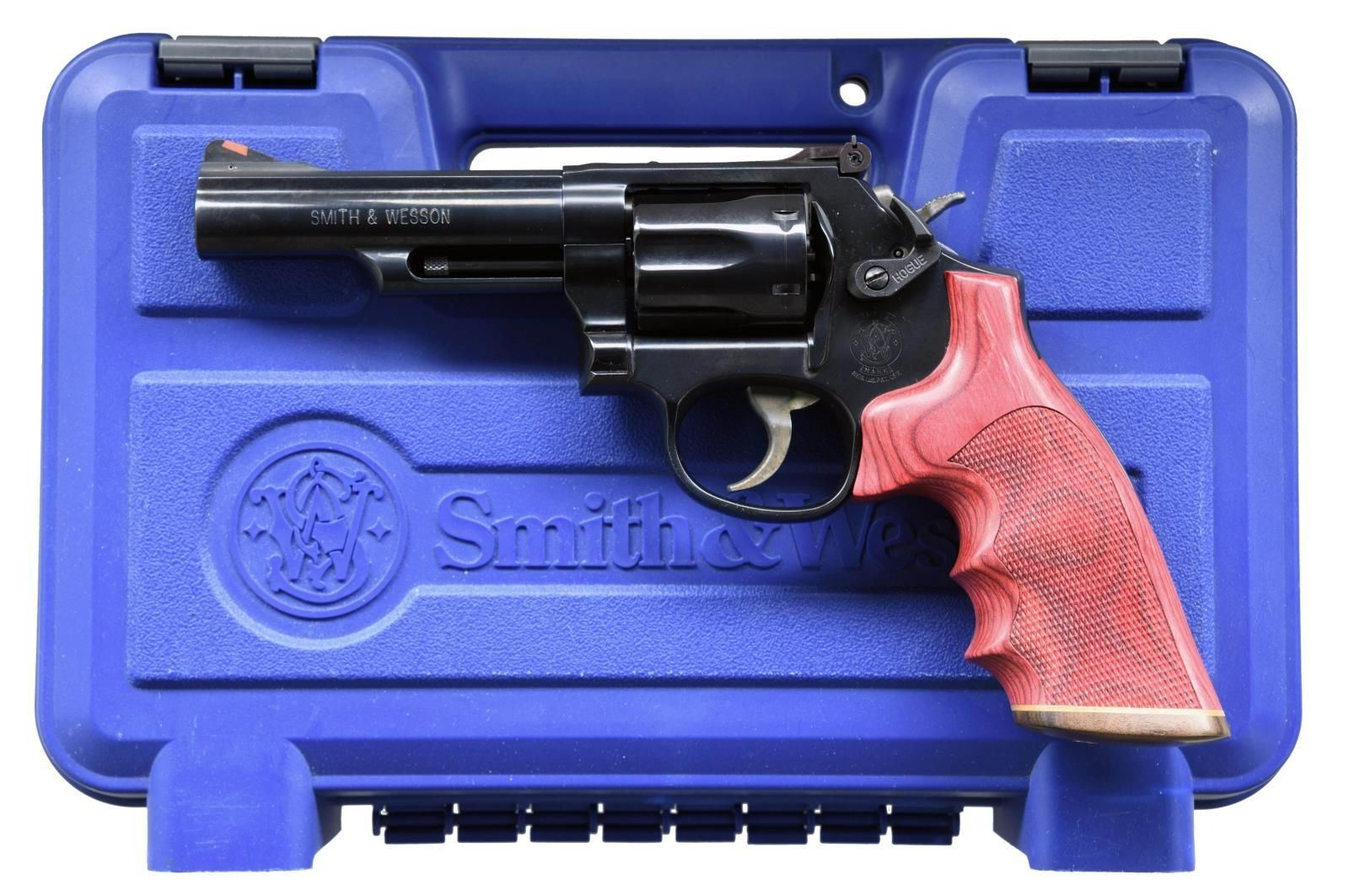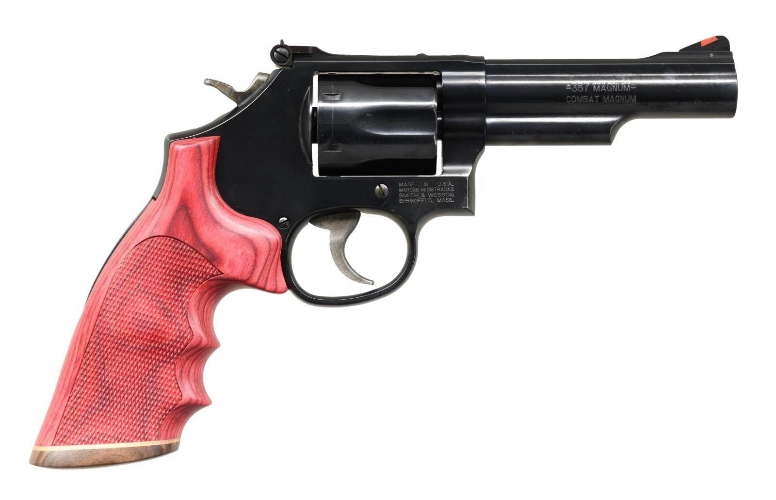 REVOLVER WITH MATCHING FACTORY CASE. Cal. 357 Mag. S# DMV5104. Bbl 4 1/4". Model 19-9 double action revolver manufactured by Smith & Wesson. The left side of the barrel is stamped "SMITH & WESSON", with "-357 MAGNUM-/ COMBAT MAGNUM" stamped on the right. Left side of frame bears the S&W trademark logo. Blued finish with a 1 checkered red laminated wood grip. Red ramp front sight with adjustable square notch rear sight. Frame is mounted with a grooved Hogue cylinder release. UNATTACHED ACCESSORIES: matching factory blue plastic hard case. CONDITION: metal components retain the vast majority of their original factory blue finish, exhibiting scattered spots of oxidation on the frame, with areas of oxidation and discoloration present on the trigger and hammer. Mirror bore, exhibiting well defined rifling throughout. Grip is very good overall. (23-2708/MLW). MODERN. $450-650.
