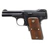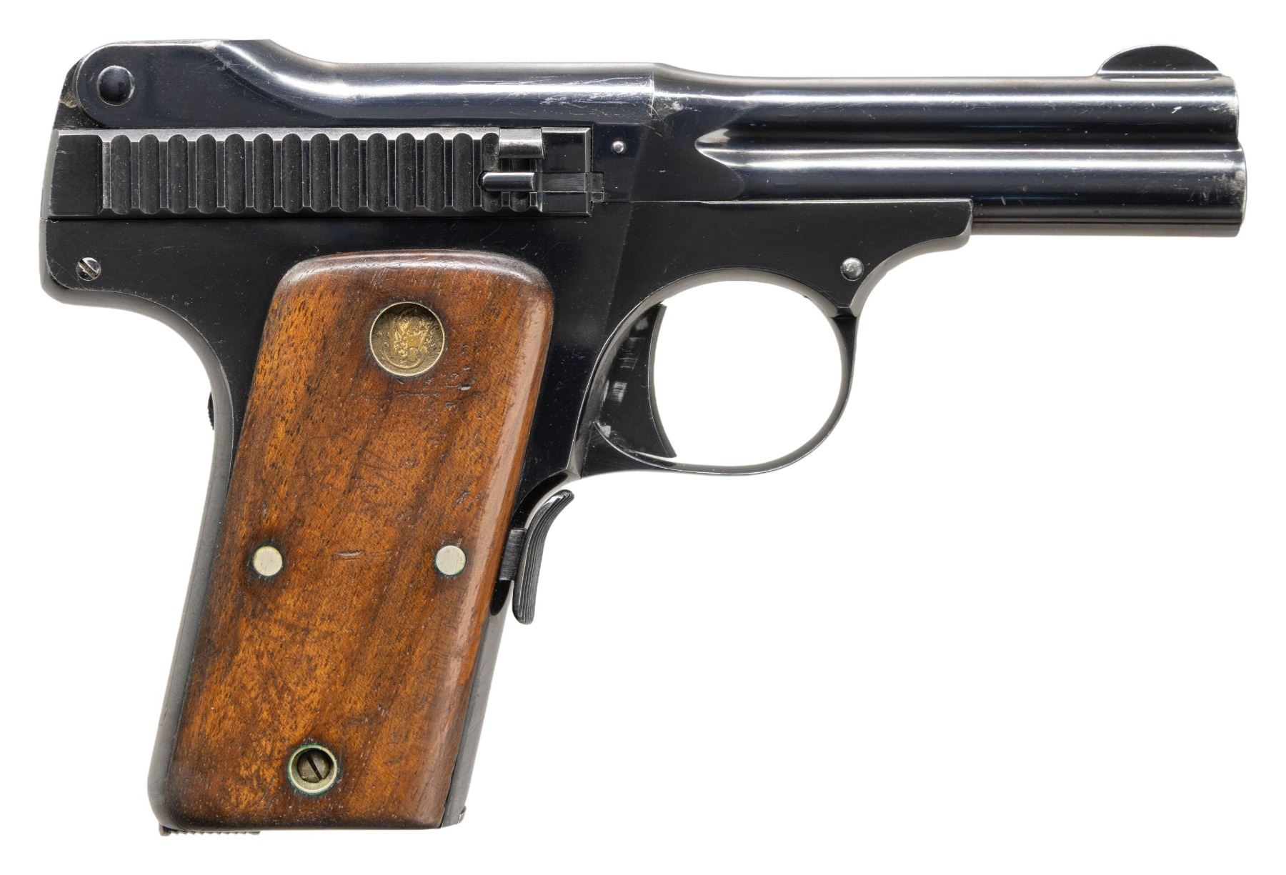 Cal. 35 S&W Auto. S# 3567. Bbl. 3 1/4". Round blade front sight. U-notch rear sight. Blued finish. Smooth walnut grips with gold S&W medallions. MAGS: 1-7 rd., unmarked. CONDITION: grips show light black staining & scattered handling marks. Metal retains 93% original blue with scattered edge wear, fading, handling marks & light oxidation. Action functions properly when hand cycled. Good bore with light oxidation but strong rifling. (25-6198/MJC). CURIO. $400-600.