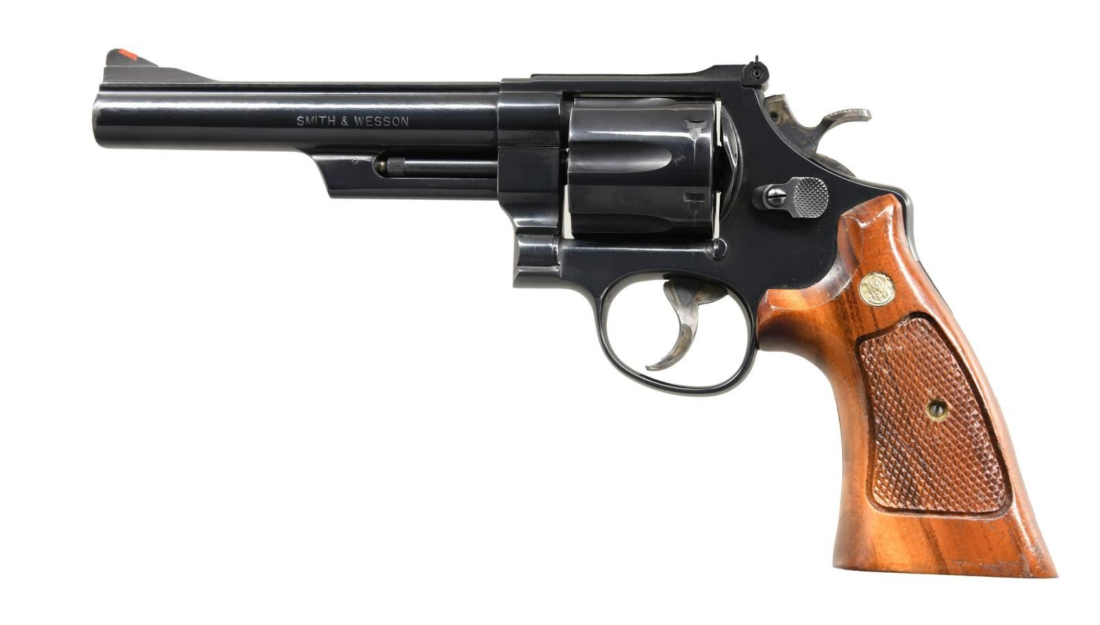 Cal. 45 Colt. S# BAR5075. Bbl. 6" pinned. Serrated ramp front sight w/ orange insert. White outline micrometer adjustable rear sight. Blue finish. Case colored target hammer & trigger. Checkered target grips w/ silver S&W medallions. CONDITION: right grip panel has a chip at front, grips otherwise show some dings & handling wear. Hammer & trigger show some fading to gray w/ light oxidation, operational wear & strong amounts of original case colors. Balance of metal retains 93% original blue w/ some edge wear, light handling wear & a drag line on cyl. Very good plus bright bore. (23-1886/MJC). MODERN. $600-1000.