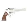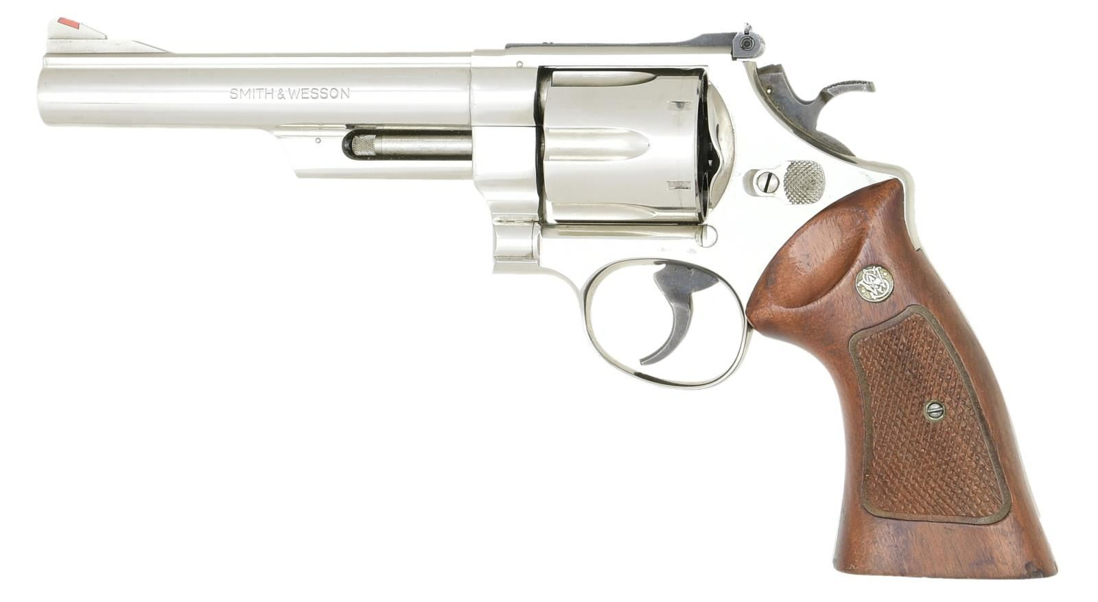 Cal. 45 Colt. S# N822015. Bbl. 6". Mfg. 1980-1982. Double action revolver built on the N Target frame w/ 3 screws. Nickel finish. 6 shot fluted cylinder Ribbed & pinned barrel. .500" checkered target hammer. .400" serrated target trigger. .125" red ramp front sight. White outline micrometer click adjustable rear sight. 10 groove serrated backstrap & front strap. Shrouded ejector. Frame, inside of left pistol grip stamped "N". Checkered hardwood grips w/ S&W medallion. CONDITION: Finish coverage complete & consistent w/ a few very light spots of thinning & drag line on cylinder. Grips are nice though have some small chips & impressions visible under close inspection. Timing appears correct. Bright bore w/ strong rifling. (23-3048/JZ). MODERN. $1.200-1,800.