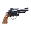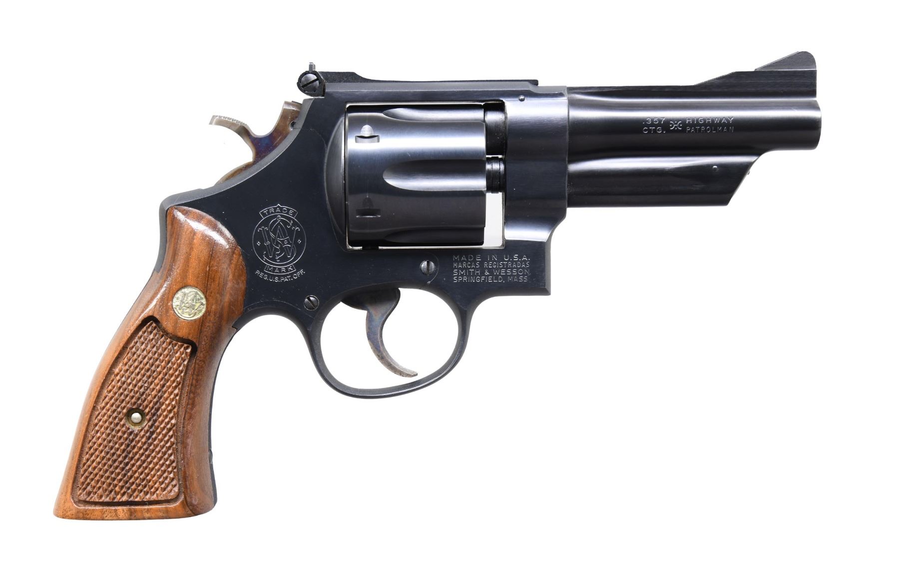 REVOLVER. Cal. 357 Mag. S# N104197. Bbl. 4" pinned. Ramped serrated blade front sight. Adjustable square notch rear sight. Mfg. 1973. Blued finish with case colored trigger & hammer. Checkered walnut grips with matching numbered right panel & silver S&W medallions. CONDITION: grips show a few handling marks. Trigger & hammer retain most of their case colors with some operational wear & light oxidation. Balance of metal retains 95% original dull blue with some light edge wear, a few minor handling marks, a patch of oxidation on backstrap & scattered light oxidation specks. Action functions properly when hand cycled. Very good bright bore. (25-590/MJC). CURIO. $300-500.