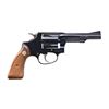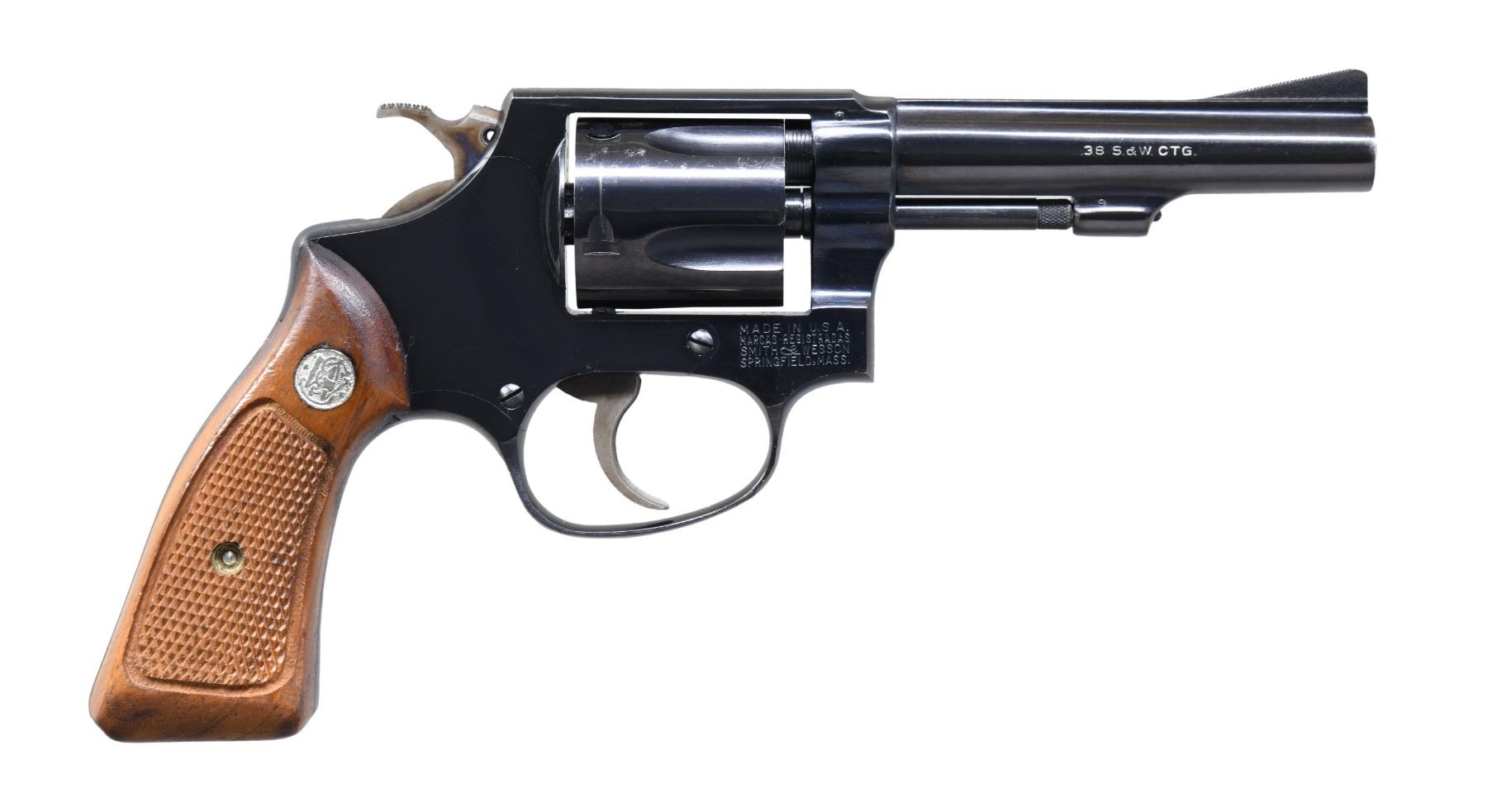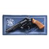 Cal. 38 S&W. S# 118729. Bbl. 4" pinned. Ramped serrated blade front sight. Fixed rear sight. Mfg. 1961-1974. Five-shot cyl. Bbl. markings have added white highlight paint. Blued finish with case colored trigger & hammer. Checkered walnut grips with matching numbered right panel & silver S&W medallions. UNATTACHED ACCESSORIES: matching numbered factory box. CONDITION: grips show light handling wear. Hammer & trigger retain most of their case colors with some light operational wear. Balance of metal retains 95% original blue with some light edge & operational wear. Action functions properly when hand cycled. Bright near excellent bore. PROVENANCE: From the Lifelong Collection of George Staden S&W Member #3451. (25-128/MJC). CURIO. $300-500.
