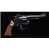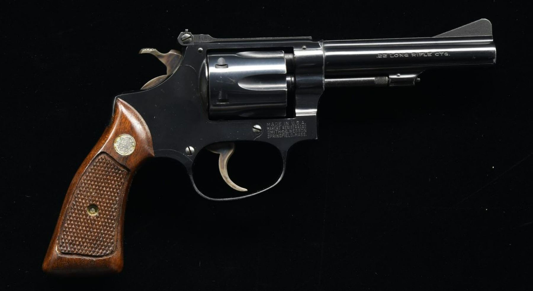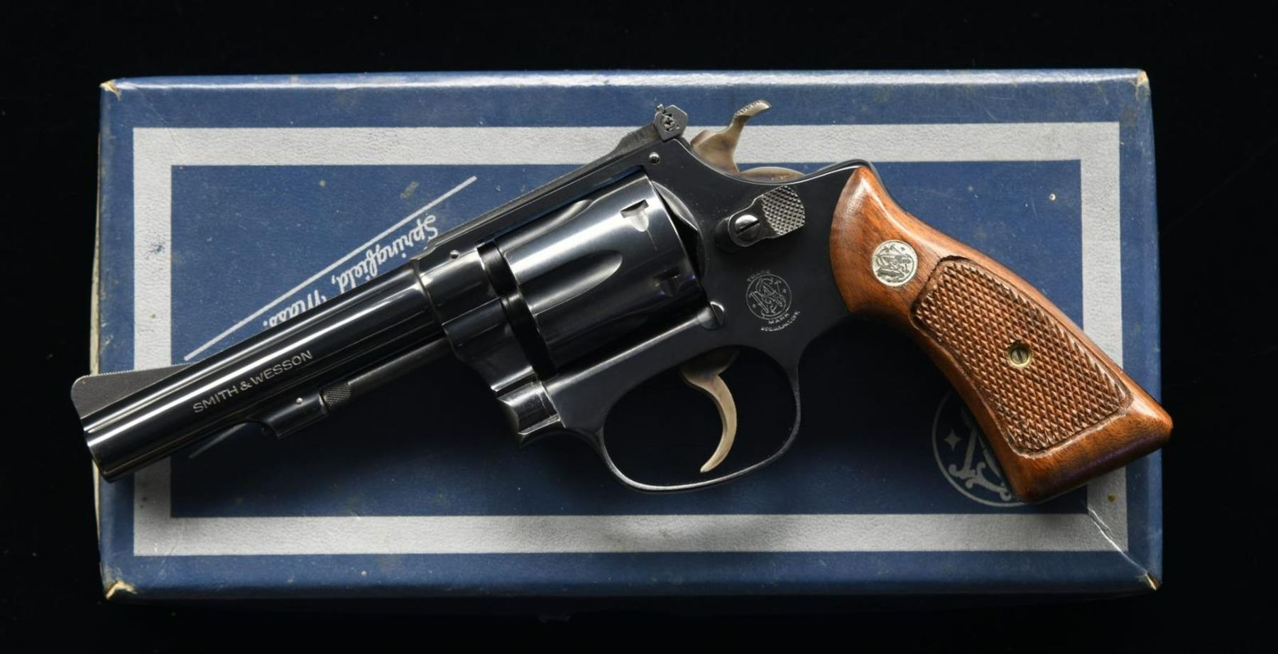 Cal. 22 LR. S# 118536. Bbl. 4" pinned. Ramped serrated blade front sight. Adjustable rear sight. Blue finish. Case colored hammer & trigger. Magna grips w/ silver & S&W medallions. UNATTACHED ACCESSORIES: matching numbered factory box, screwdriver, cleaning rod, bore brush, paperwork. two spare pairs of S&W medallion Magna grips, a modern S&W 40 hardcase, cable lock & more paperwork. CONDITION: grips show a couple chips & some scattered handling wear. Hammer & trigger retain nearly all their case colors w/ some light scratches & operational wear. Balance of metal retains 95% original blue w/ a few small spots oxidation, a few light scratches, some edge wear & a drag line on cyl. Bright very good plus bore. (23-5075/MJC). MODERN. $500-800.