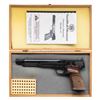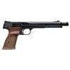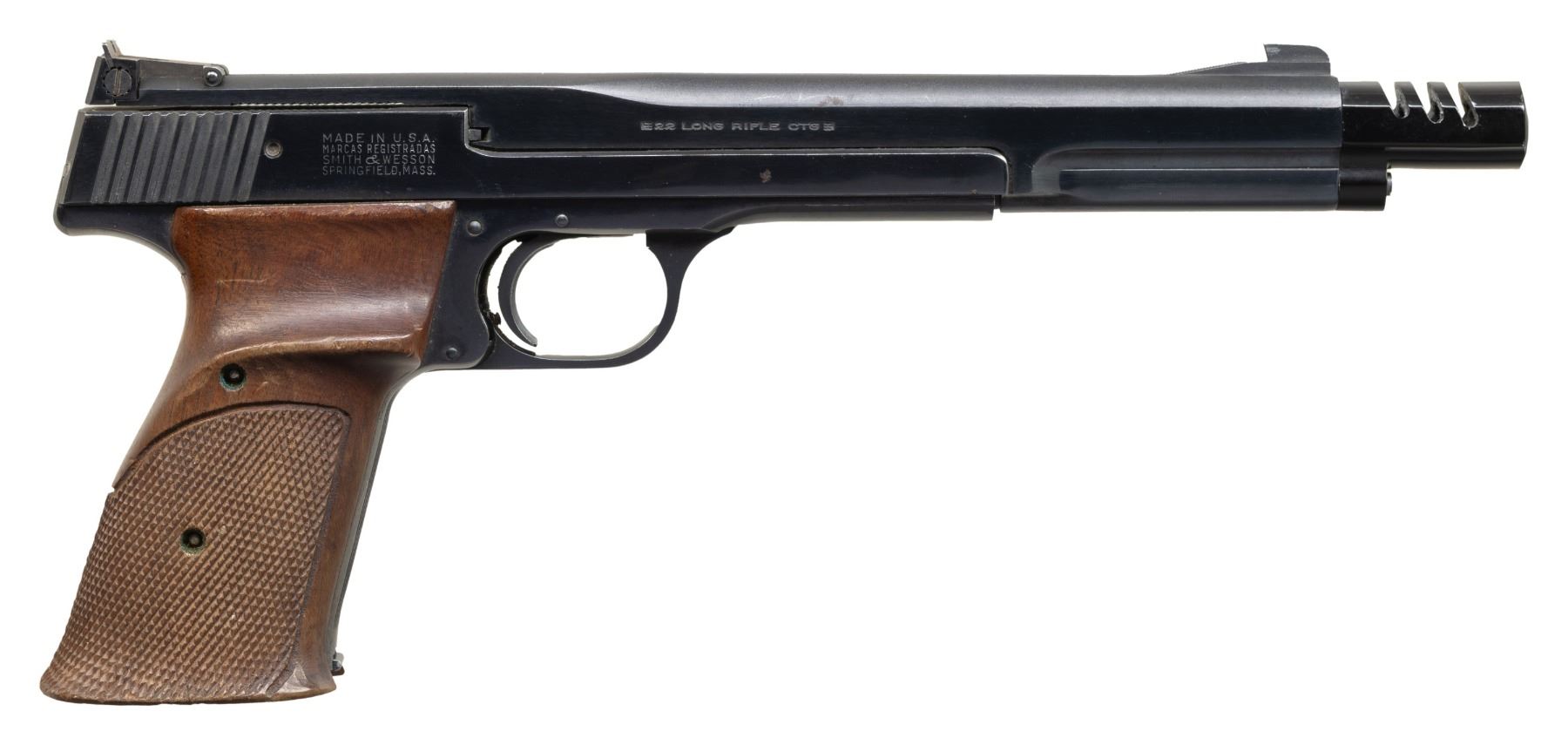 Cal. 22 LR. S# 10146. Bbl. 7 3/8" with muzzle brake. Patridge front sight. Adjustable square notch rear sight. Mfr. prior to 1970 as indicated by lack of serial number prefix Blued finish. Checkered hardwood thumbrest grips. MAGS: 1-10 rd. UNATTACHED ACCESSORIES: hardwood case with carved S&W logo on lid, manual & 50 rd. cartridge holder. CONDITION: grips show a small chip on left side, scattered dings, light scratches & handling marks. Metal retains 95% original blue with some strap wear, a couple small oxidation stain spots, edge war & handling marks. Action functions properly when hand cycled. Bright near excellent bore. (25-6099/MJC). CURIO. $600-900.