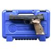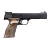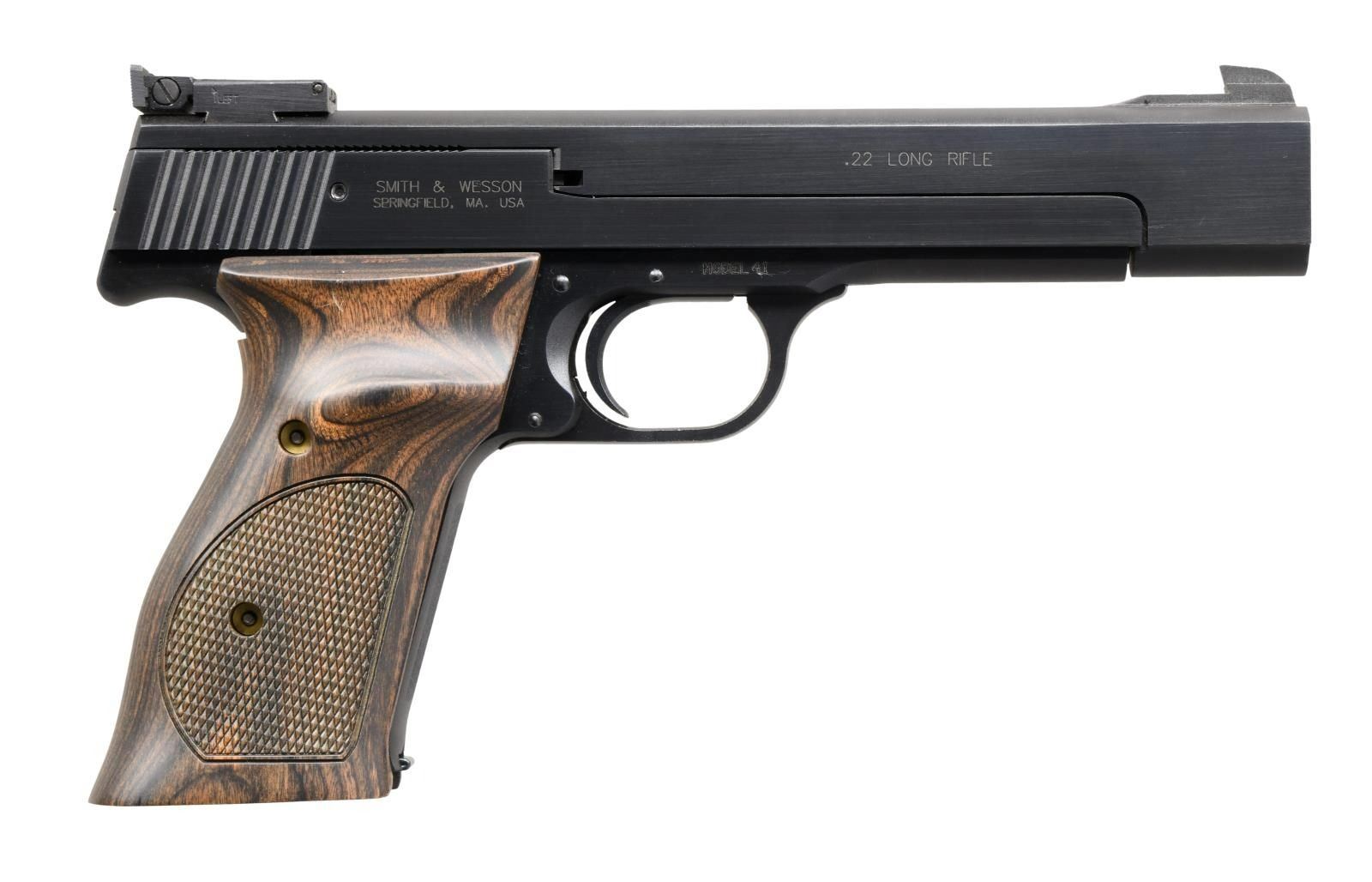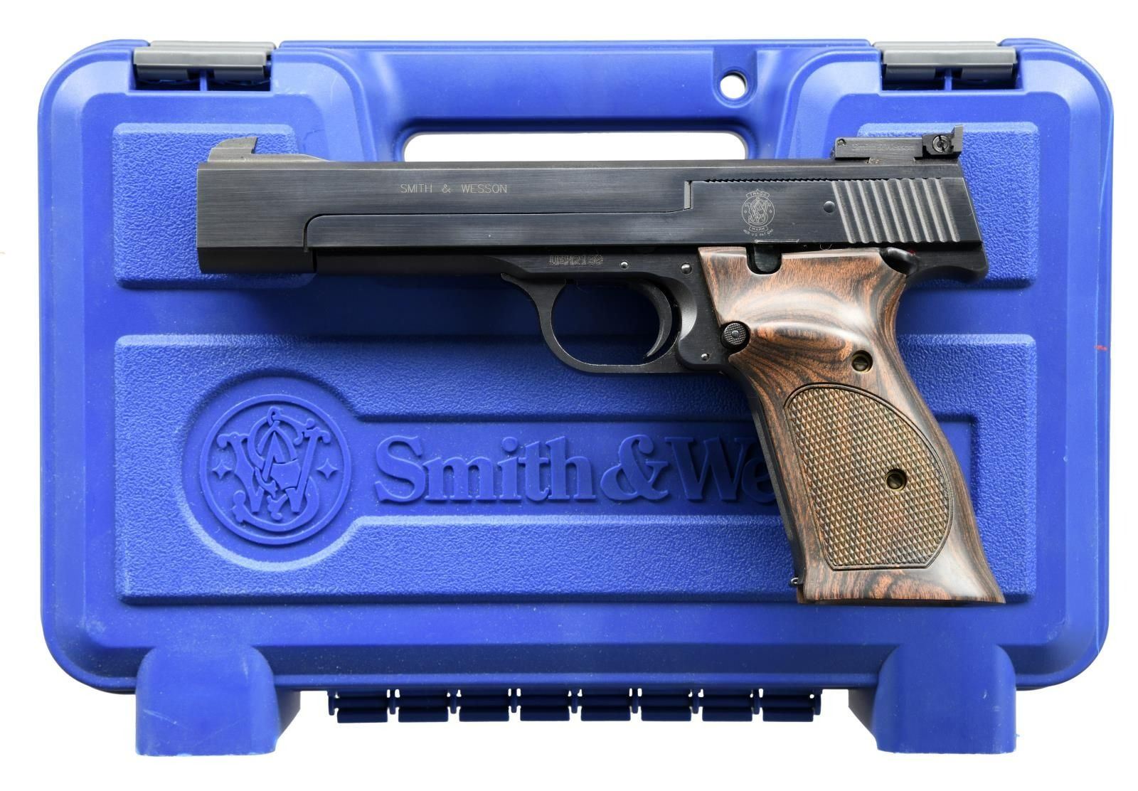 Cal. 22 LR. S# UEH2139. Bbl 5 ½”. Recent production S&W M41 with patridge front sight and fully adjustable rear sight bearing the Smith & Wesson name and logo. Left side of barrel marked “SMITH & WESSON”; the right side marked for the .22 Long Rifle caliber. The slide marked with the S&W logo (left) and address in Springfield, MA (right). Frame is marked with the serial number (left) and model (right) and has a vertically serrated frontstrap. Exotic hardwood grips, each panel having a shallow thumb rest over a generously checkered field, secured with two screws. Magazine marked with the number “5/ (S&W LOGO)/ .22 Caliber”, “S&W” appearing on the floorplate. UNATTACHED ACCESSORIES: w/box. CONDITION: gun presents as virtually new with no sharp edge wear or thinning. Single superficial scratch on upper portion of right grip. Mirror bore. Perfect manual mechanics. PROVENANCE: The Collection of Gun Sport Ltd owned by Jon R. Thomas. (23-4435/LA). MODERN. $800-1,200.