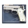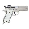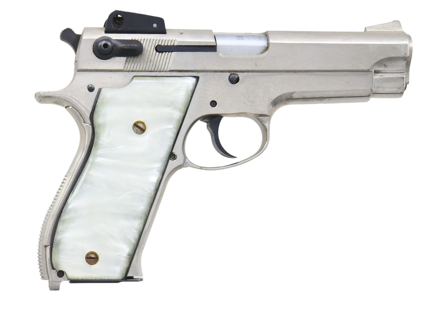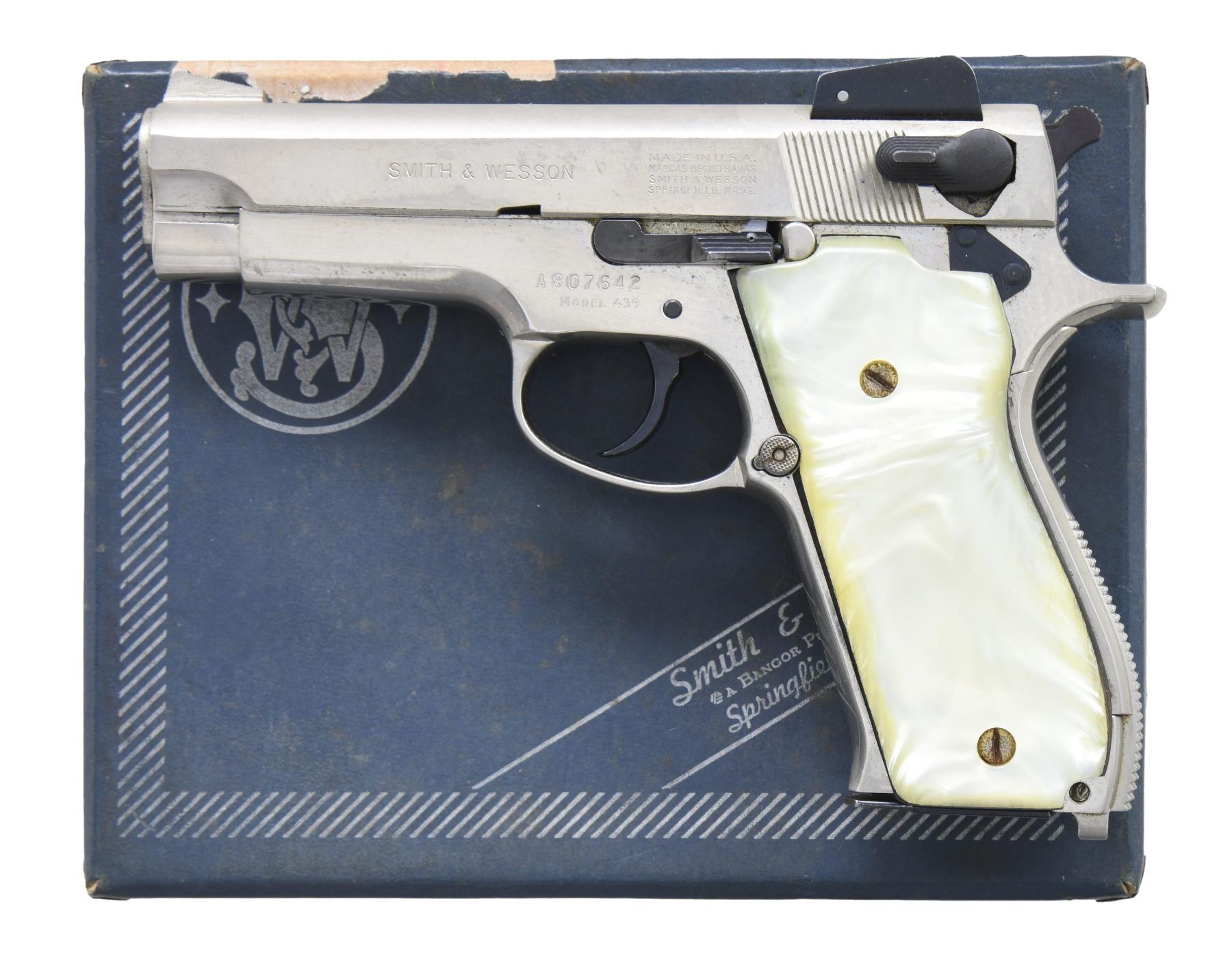 Cal. 9mm Luger. S# A807642. Bbl. 4". Ramped serrated blade front sight. Adjustable rear sight. Ambi safety that also acts as a decocker. Mfg. 1983. Nickel finish blued small parts. Simulated Mother of Pearl grips. MAGS: 2-8 rd. UNATTACHED ACCESSORIES: replacement S&W 39-2 box. CONDITION: grips show some light handling marks. Metal shows a couple patches of flaking, some scattered edge wear, light scratches & handling marks. Action functions properly when hand cycled. Bright near excellent bore. PROVENANCE: From the Lifelong Collection of George Staden S&W Member #3451. (25-143/MJC). MODERN. $400-600.