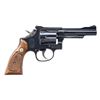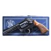 Cal. 22 Mag. S# 86K4785. Bbl. 4" pinned. Ramped serrated blade front sight. Adjustable square notch rear sight. Mfg. 1980. Blued finish with case colored trigger & hammer. Checkered walnut grips with mismatch numbered right panel & silver S&W medallions. UNATTACHED ACCESSORIES: matching numbered factory box with manual & paperwork. CONDITION: grips show a few light handling marks. Trigger & hammer retain most of their case colors with some operational wear. Balance of metal retains 97% original blue with some edge & operational wear. Bright near excellent bore. (25-640/MJC). MODERN. $800-1200.