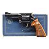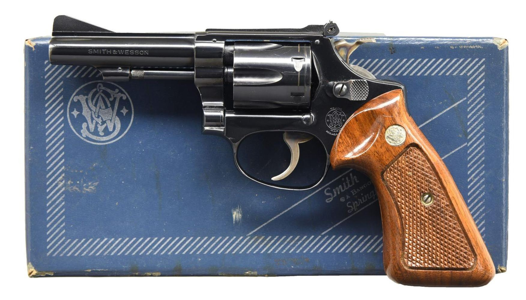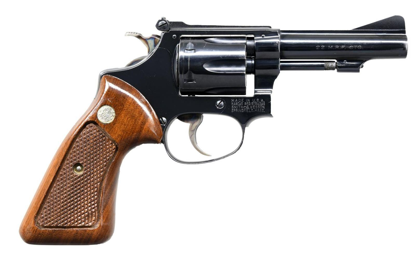 Cal. 22 Mag. S# M11992. Bbl. 3 1/2" pinned. Ramped serrated blade front sight. Adjustable rear sight. Mfg. 1969-71. Blue finish. Case colored hammer & trigger. Checkered Magna grips w/ silver S&W medallions. UNATTACHED ACCESSORIES: factory box that appears to be matching numbered to gun w/ manual, screwdriver, cleaning rod & bore brush. CONDITION: grips show a couple spots of flaking varnish, some light dings & handling marks. Trigger & hammer retain nearly all their case colors w/ some light operational wear. Balance of metal retains 90% original blue w/ some operational wear, scattered light scratches, a couple small spots of oxidation & some edge wear. Bright very good plus bore. PROVENANCE: The Collection of Gun Sport Ltd owned by Jon R. Thomas. (23-3943/MJC). CURIO. $800-1200.