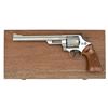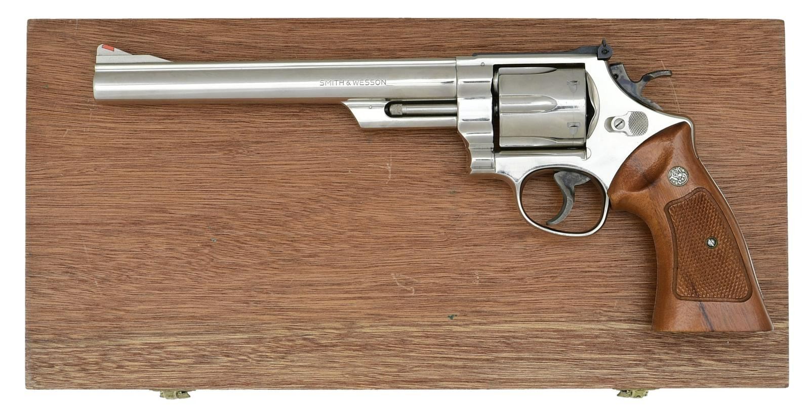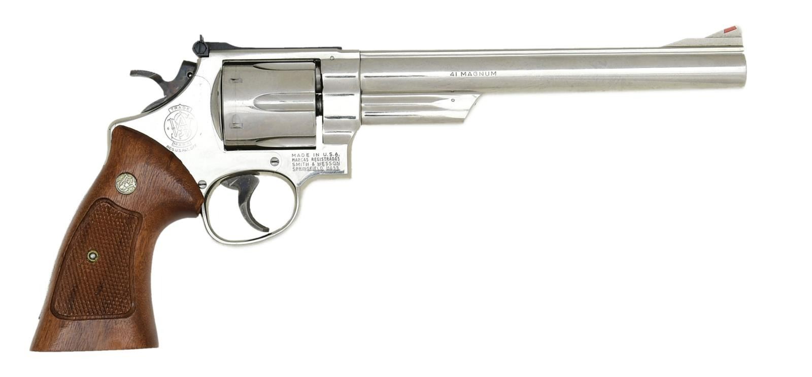 Cal. 41 Mag. S# N634043. Bbl. 8 3/8" pinned. Ramped serrated front sight w/ orange insert. Adjustable micrometer rear sight w/ white outline. Nickel finish. Case colored target hammer & trigger. Target grips w/ silver S&W medallions. UNATTACHED ACCESSORIES: presentation case w/ cleaning rod, two bore brushes & S&W screwdriver. CONDITION: grips show some light handling wear. Trigger & hammer show light operational wear but retain nearly all their original case colors. Balance of metal retains nearly all original nickel finish w/ a drag line on cyl., some light oxidation specks & handling wear. Very good plus bright bore. (23-1779/MJC). MODERN. $700-1000.