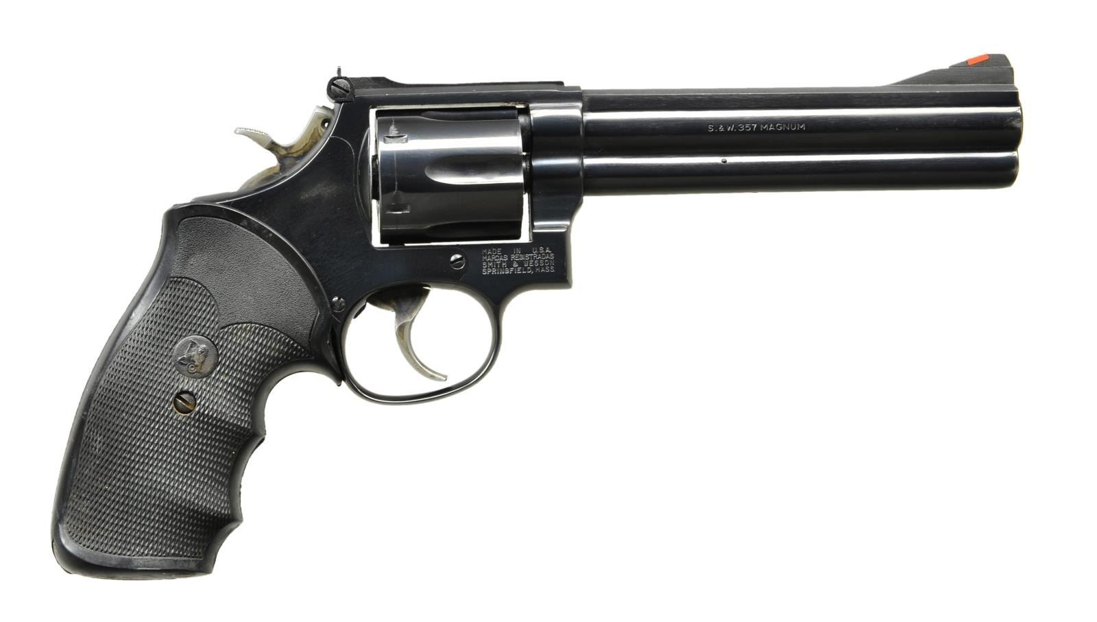 Cal. 357 Magnum. S# AJH6738. Bbl.6". Mfg. 1985. Traditional double action, L-Frame revolver. 6 shot fluted cylinder. Red ramp front & white outline rear sights. Full lug below barrel. Checkered hammer spur & cylinder release. 10 line serrated front & back straps. Black rubber Pachmayr wraparound grips. UNATTACHED ACCESSORIES: Blue cardboard factory box. CONDITION: Finish is complete & consistent w/ some gentle thinning primarily at muzzle & in areas of mechanical intervention, such as a light cylinder drag line. Bright bore w/ strong rifling. (22-6381/JZ). MODERN. $350-650.