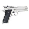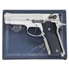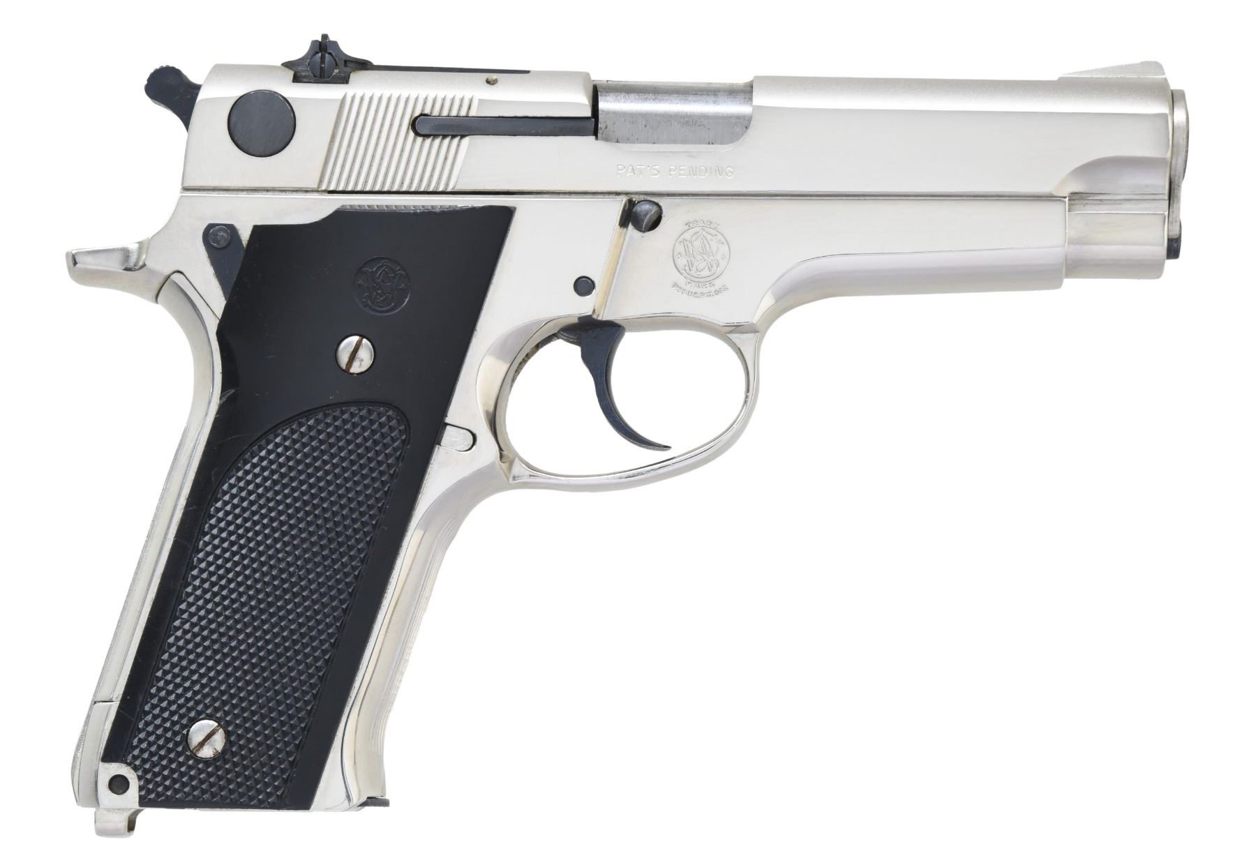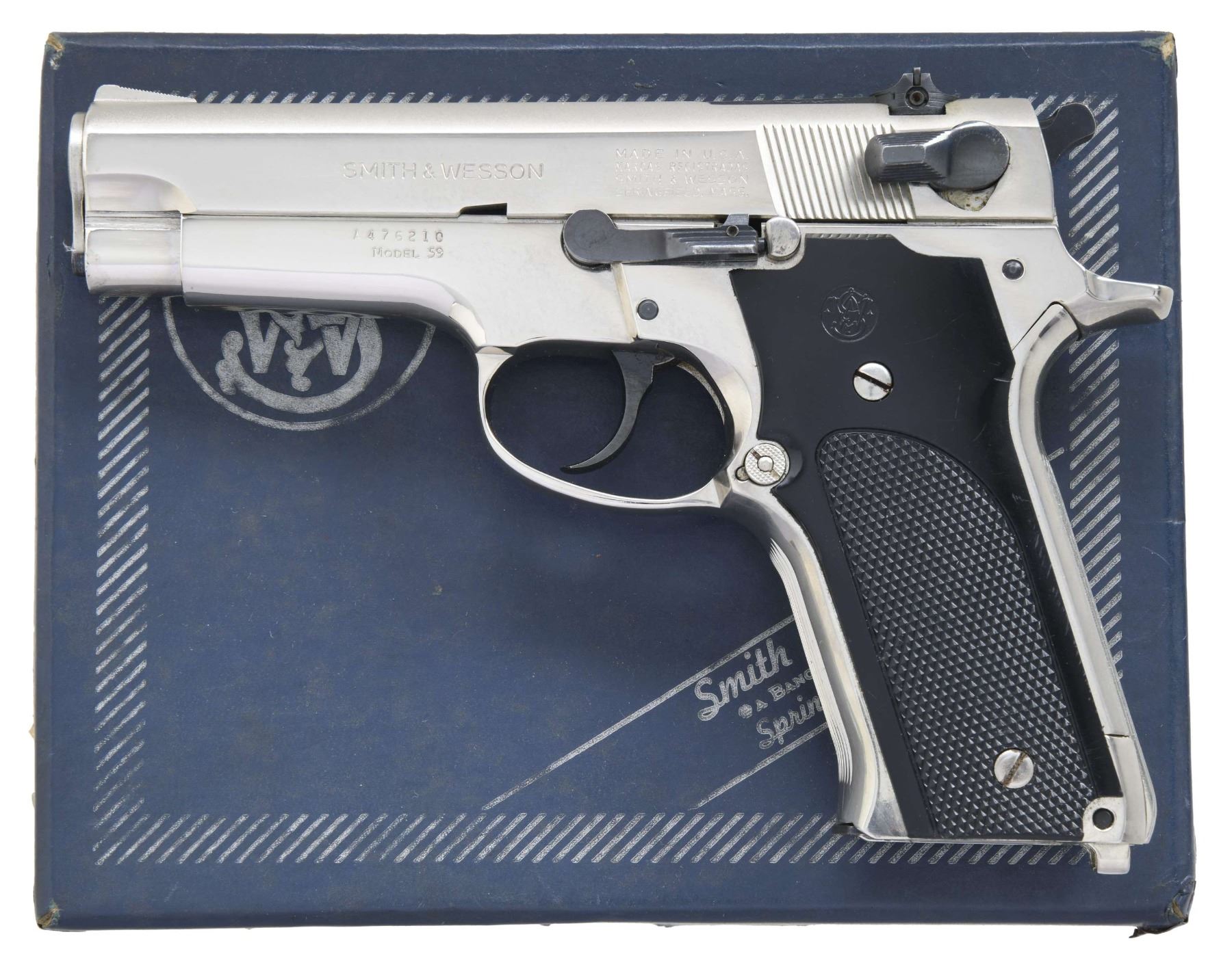 Cal. 9mm Luger. S# A476210. Bbl. 4". Ramped serrated blade front sight. Square notch rear sight. Nickel finish with blued small parts. Checkered black grips with S&W monograms. MAGS: 2-14 rd. UNATTACHED ACCESSORIES: factory box that appears to have been renumbered to match. CONDITION: grips show some handling marks & light wear. Metal near excellent. Action functions properly when hand cycled. Bright near excellent bore. PROVENANCE: From the Lifelong Collection of George Staden S&W Member #3451. (25-166/MJC). MODERN. $500-800.