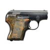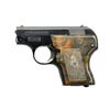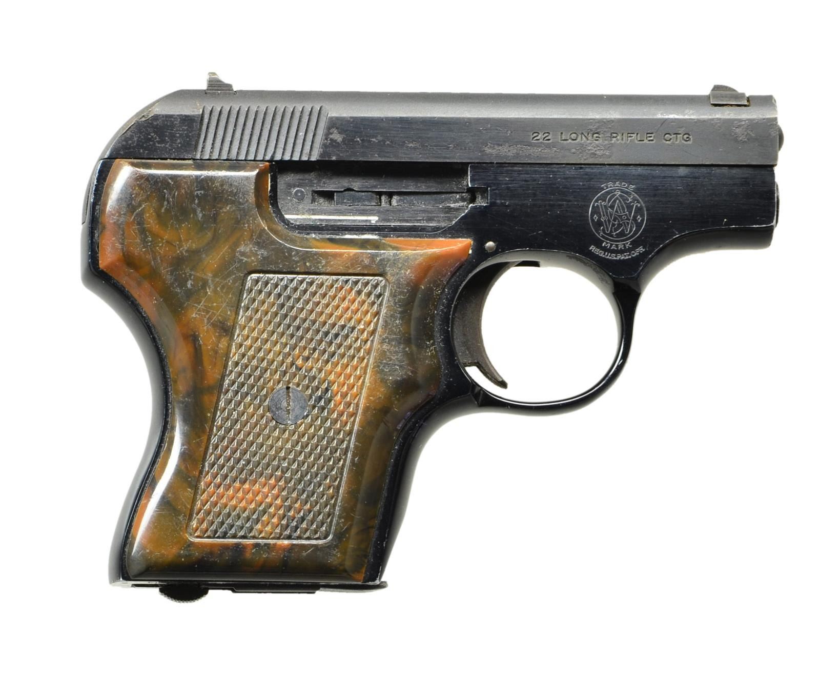 Cal. 22LR. S# B51872. Bbl.2". Mfg. 1971-1973. A small, alloy frame rimfire pistol manufactured in the early 1970s. Blued finish. Serrated slide w/ fixed sights. Left side safety. Bottom magazine release. Brown, 2-piece plastic checkered grips. MAGS: 1 steel 5rd. CONDITION: Finish coverage is complete & consistent w/ some thinning on high spots. Aluminum frame demonstrates some light gouging around muzzle and at bottom of pistol grip. Grip panels solid w/ several light scratches under close inspection. Bore is bright w/ strong rifling. PROVENANCE STATEMENT: Estate collection of Thomas F. Wolfinger. (22-6167/JZ). MODERN. $200-400.