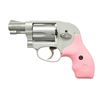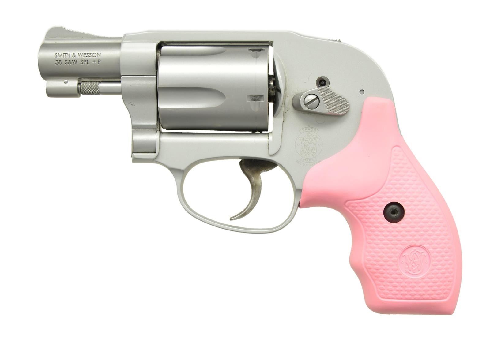 REVOLVER. Cal. 38 S&W Special..S# CXX0880. Bbl. 2". Mfg.2015. Traditional double action, round butt, J-Frame alloy receiver w/ shrouded hammer. Rated for +P 38 Special ammo. Stainless steel barrel & 5-shot fluted cylinder. Fixed sights. Smooth backstrap. Serrated hammer spur & checkered cylinder release. Internal key lock system. Pink S&W rubber boot grips. UNATTACHED ACCESSORIES: Factory blue plastic shipping box, paperwork, keys & spare black rubber S&W boot grips. CONDITION: As typical w/ the smaller guns, it appears to have spent most of its life in a holster as opposed to seeing heavy range use. Finish is free of any noticeable blemishing w/ only a thin drag line on the cylinder and some carbon ringing to illustrate prior use. Bright bore w/ strong rifling. (22-6332/JZ). MODERN. $350-650.