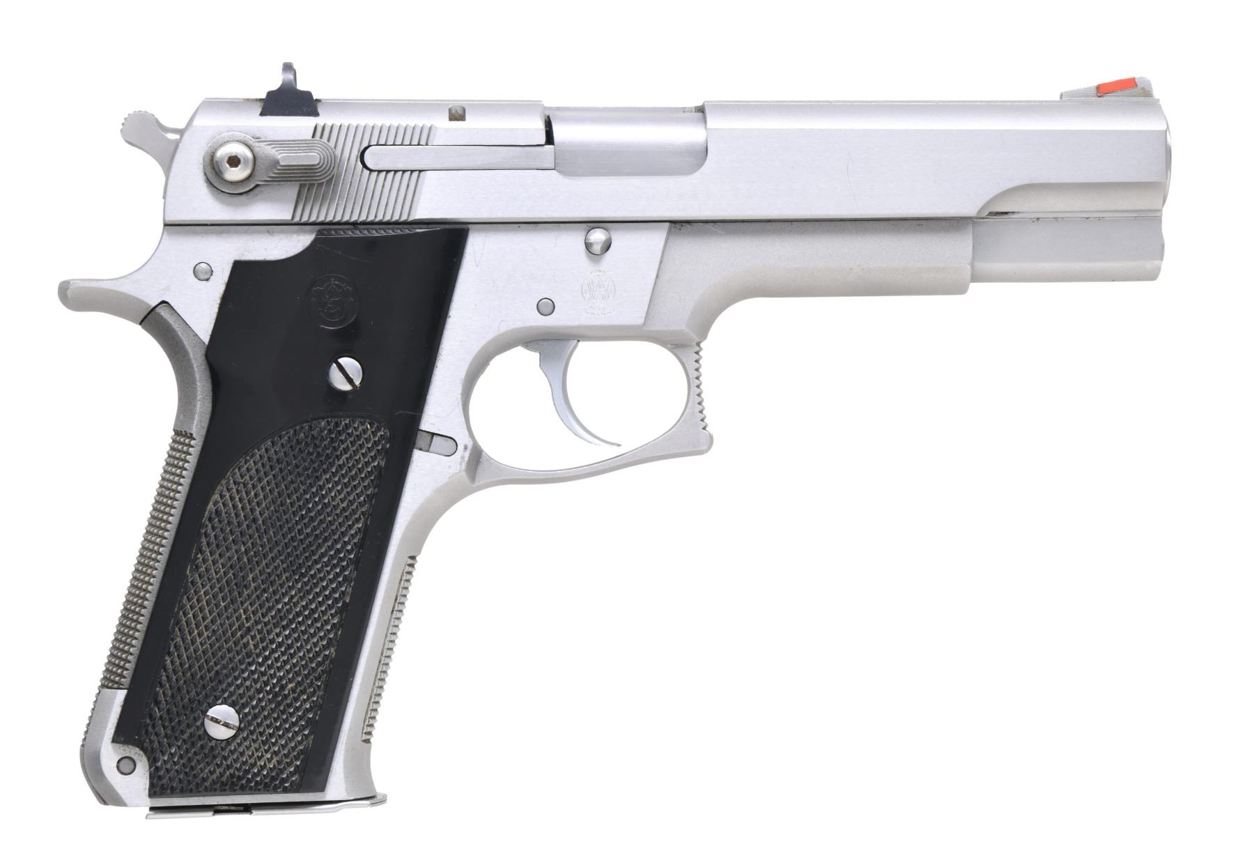 Cal. 45 ACP. S# TAL4660. Bbl. 5". Ramped serrated blade front sight with orange insert. Square notch rear sight with white outline. Mfg. 1986. Ambi safety that also acts as a decocker. Stainless finish. Black plastic checkered grips with S&W monograms. MAGS: 2-8 rd. CONDITION: grips show some dirt staining, scratches & handling marks. Metal shows scattered light scratches & handling wear. Action functions properly when hand cycled. Bright very good + bore. PROVENANCE: From the Lifelong Collection of George Staden S&W Member #3451. (25-175/MJC). MODERN. $400-600.